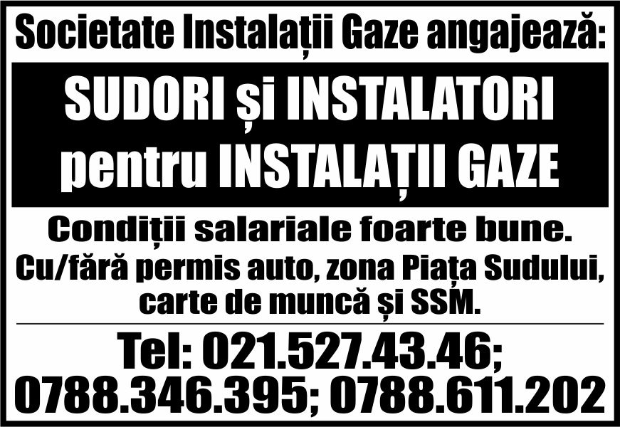 pentru societate instalatii gaze, conditii salariale foarte bune.