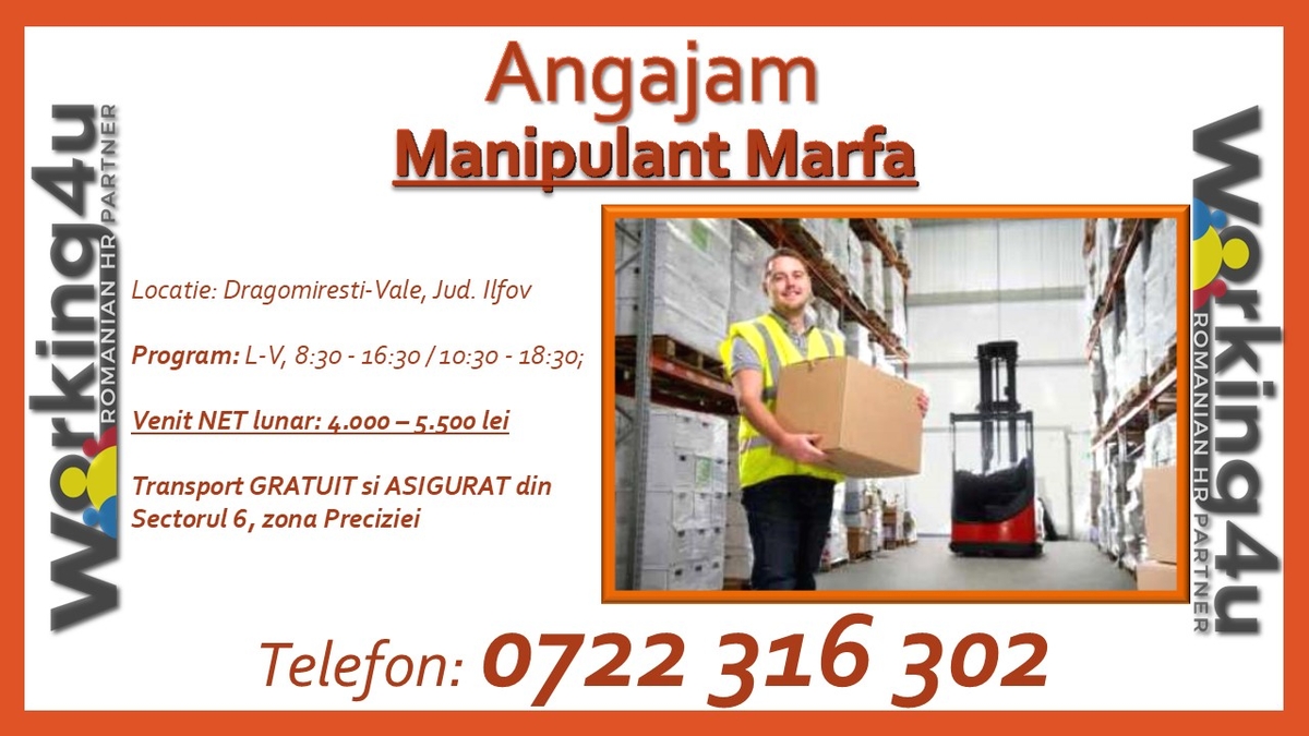 Pentru clientul nostru, companie specializata in distribuirea de piese si lubrifianti pentru toate marcile de autovehicule, cu sediul situat in Dragomiresti-Vale, Jud. Ilfov, suntem in cautare de noi colegi cu experienta pentru postul de Manipulant Marfa.