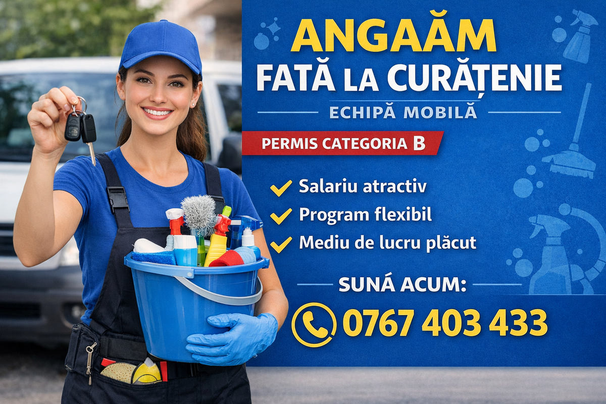 Firma de curatenie angajeaza fata pentru echipa mobila, permis de conducere categoria B.