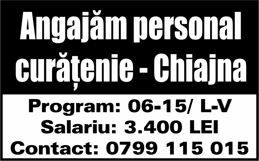 Angajam personal curatenie –Chiajna. Program: 06-15/ L-V. Salariu: 3400 LEI