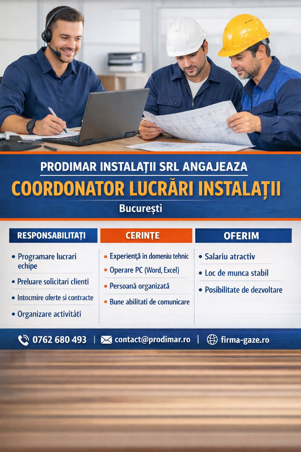 Compania PRODIMAR INSTALATII, firma autorizata ANRE specializata in verificari si revizii instalatii de gaze, centrale termice si instalatii de apa, angajeaza Coordonator lucrari instalatii pentru punctul de lucru din Bucuresti