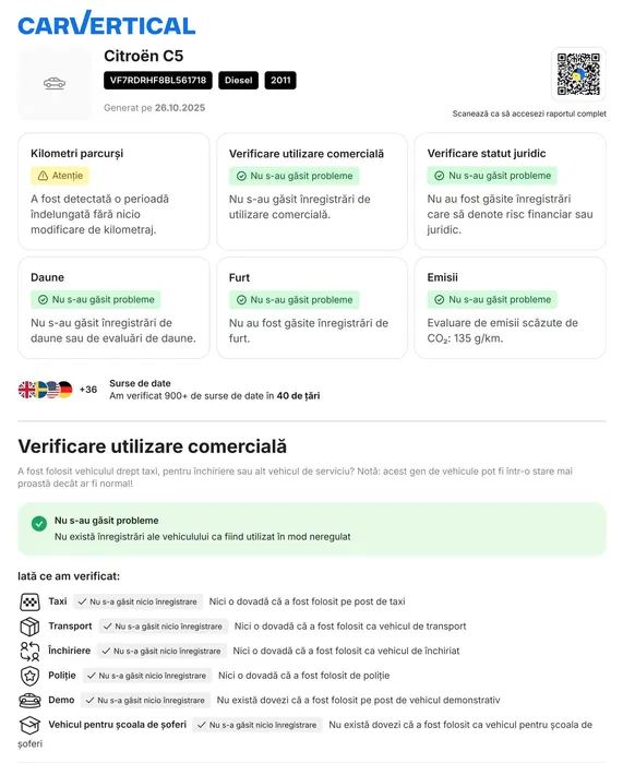 Scanati codul QR din a doua poza pentru raportul complet CarVertical.