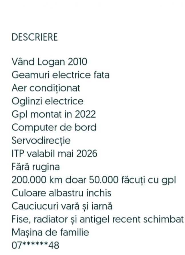 Vand masina marca auto Dacia Logan din anul 2010.Geamuri electrice fata,aer conditionat, oglinzi electrice,radio cd player, servodirectie, computer de bord,Gpl montat in 2022,ITP valabil pana in mai 2026,fara rugina, am cauciucuri vara + iarna .200.000km doar 50.000 sunt facuti pe Gpl ,masina este impecabila. Recent am schimbat fise, radiator si antigel . Ultimul pret este de 2300 .