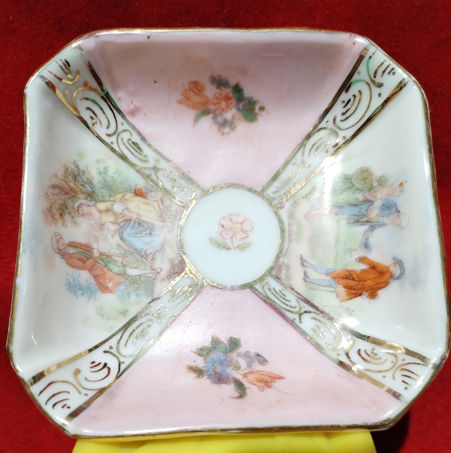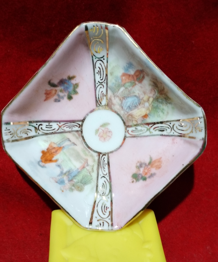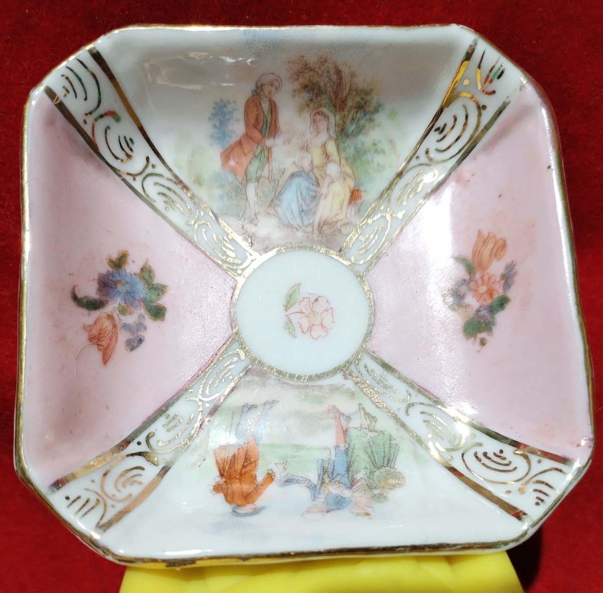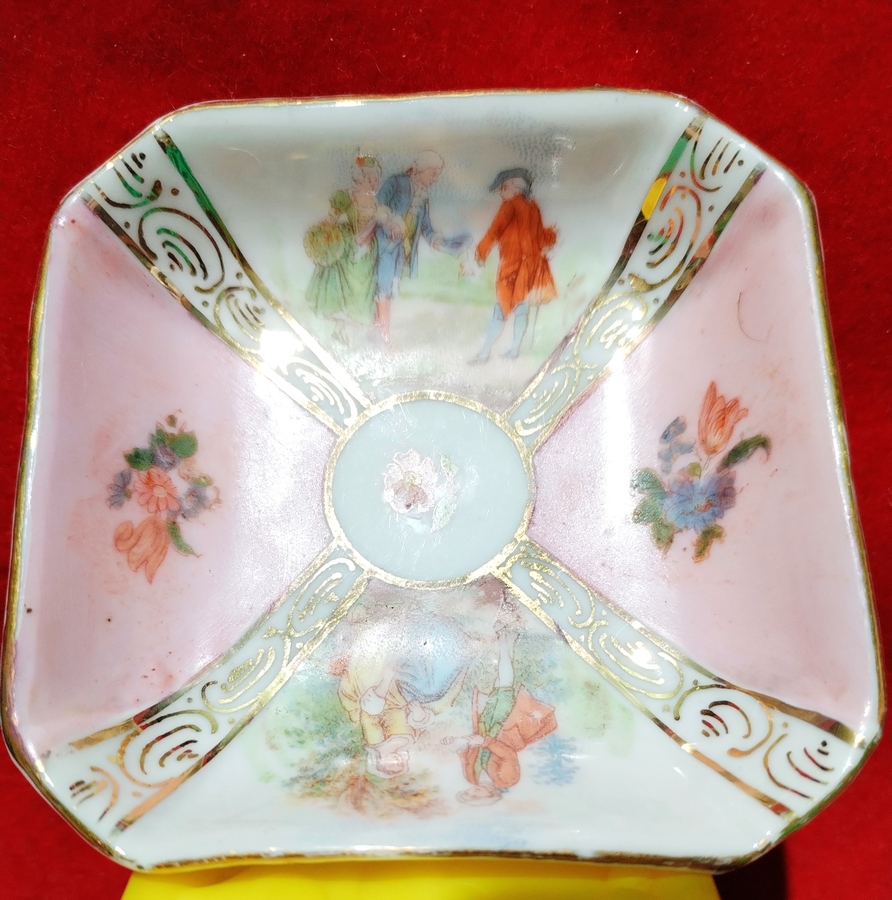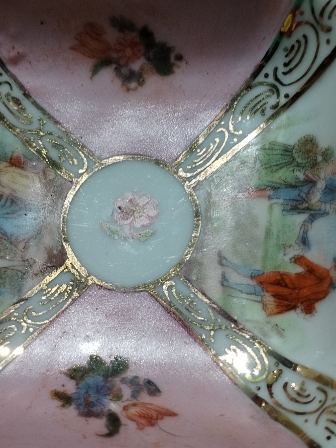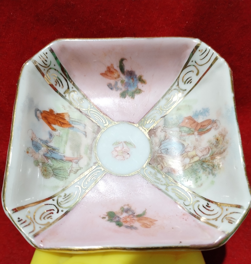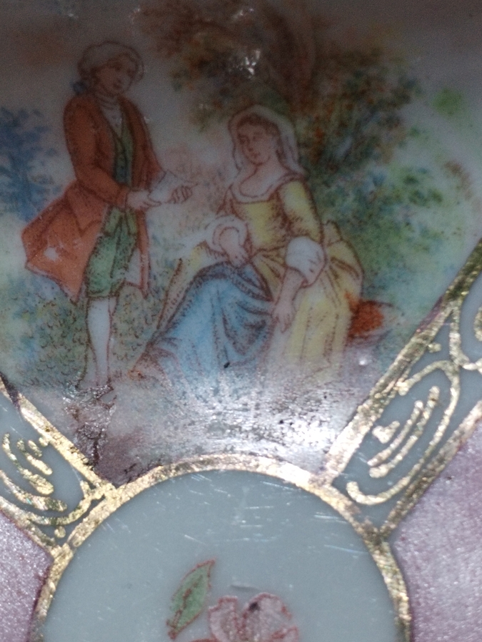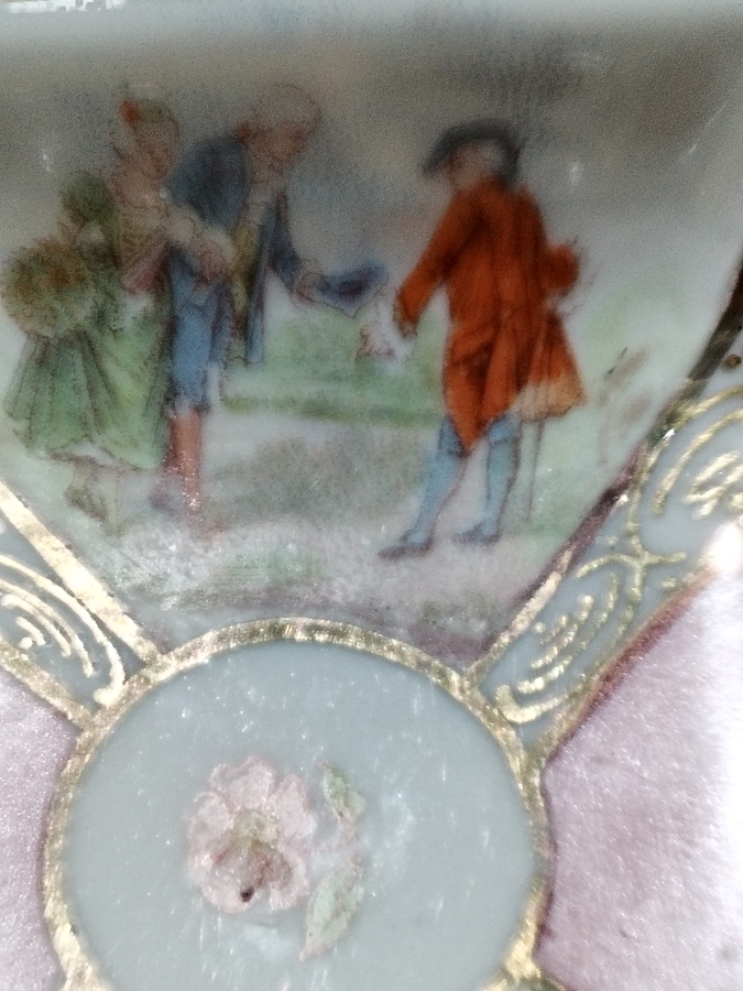 Este o piesa autentica de epoca, lucrata manual, cu o scena romantica in stil Rococo, specifica perioadei Belle Epoque.