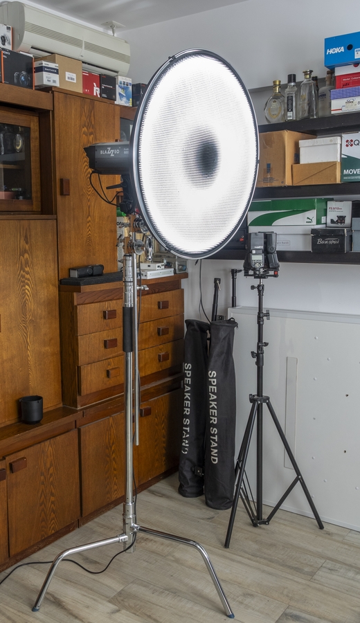 C-stand cu boom-arm + blitz + beauty dish cu grid