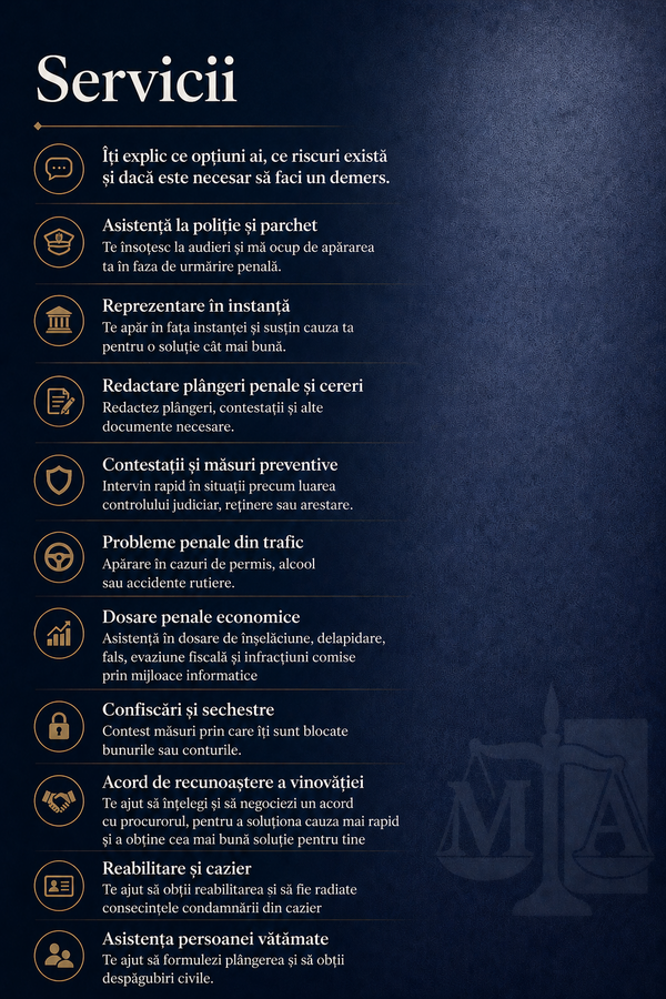Cabinet de avocat din Bucuresti ofera servicii in drept penal: consultanta, redactare plangeri si contestatii, asistenta si reprezentare in fata organelor de urmarire penala si a instantelor de judecata.