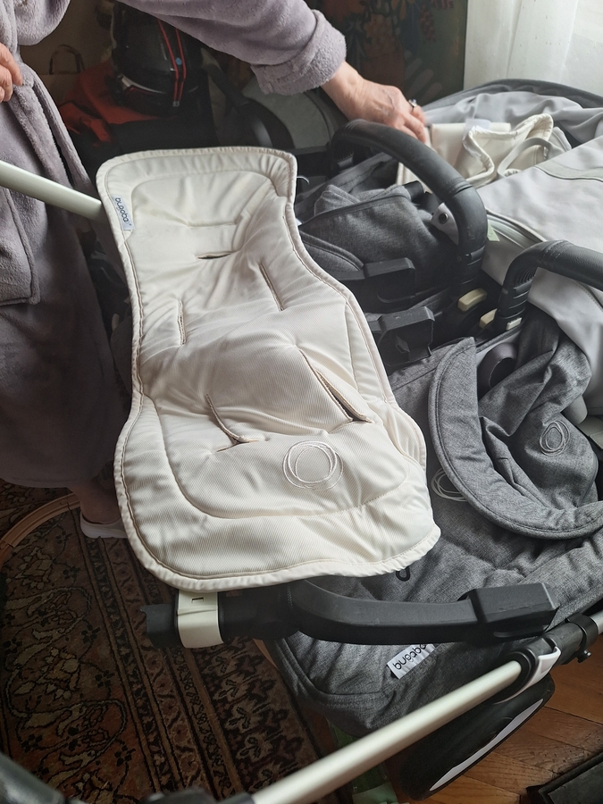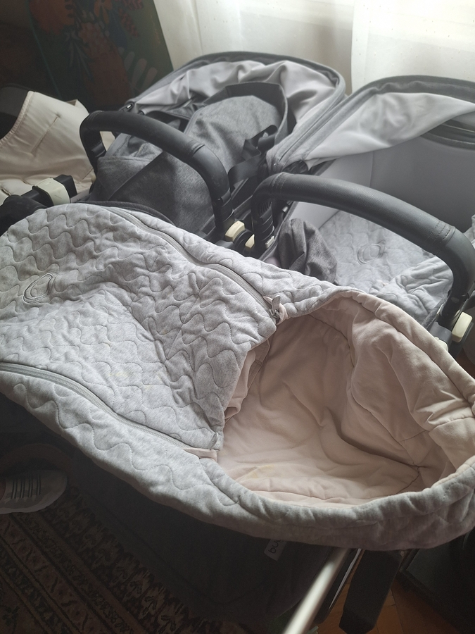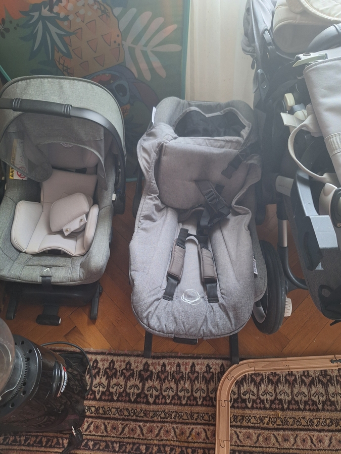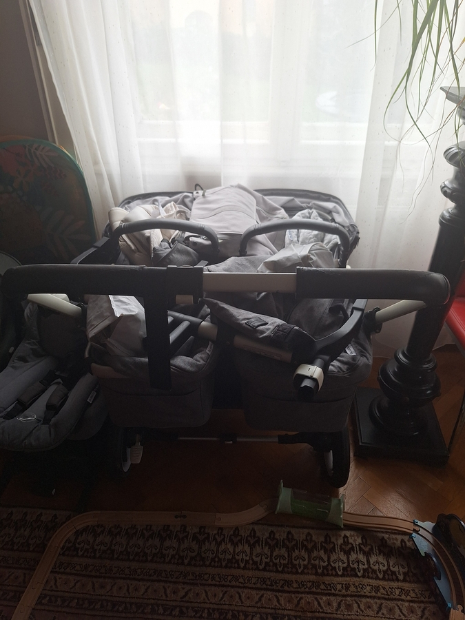 Vand carucior gemeni complet echipat cu port-bebe, protectii ploaie, genti transport scutece si scaune masina