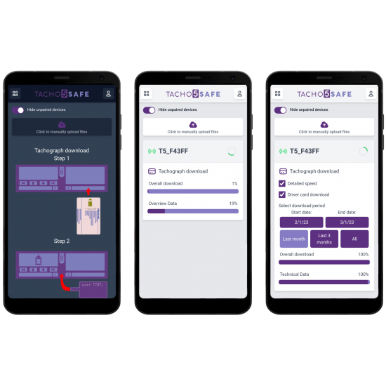 Tacho5Safe+ este a 5-a generatie de dispozitive manuale pentru descarcarea tahografelor si a cardurilor de sofer, remarcandu-se prin functionalitatile si capabilitatile sale avansate. Datorita conexiunii Bluetooth, poate fi utilizat impreuna cu aplicatia mobila pentru a salva automat descarcarile in contul tau din cloud pe TachoSafe Web. Este un dispozitiv ergonomic, usor de folosit, potrivit atat pentru soferi independenti, cat si pentru flote mici sau operatori de transport de mari dimensiuni.