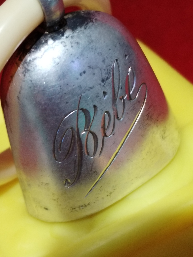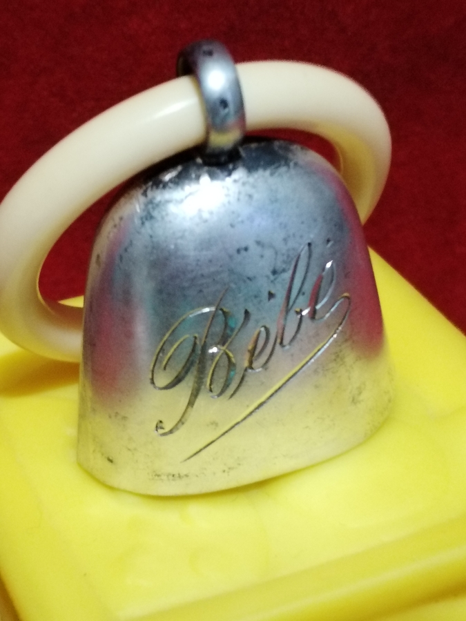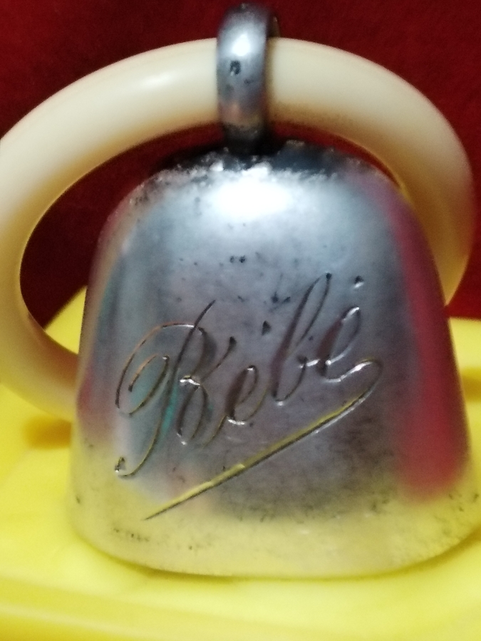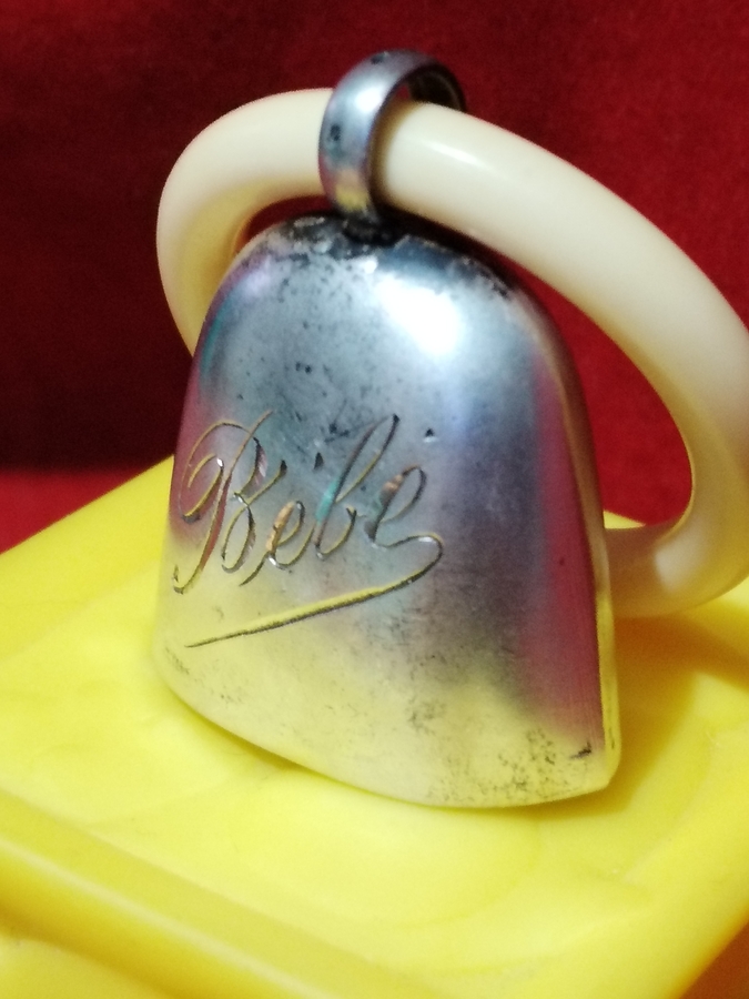 Clopotel francez din argint cu inel din fildes pentru bebelusi, perioada Belle Epoque, inscriptionat Bebe.