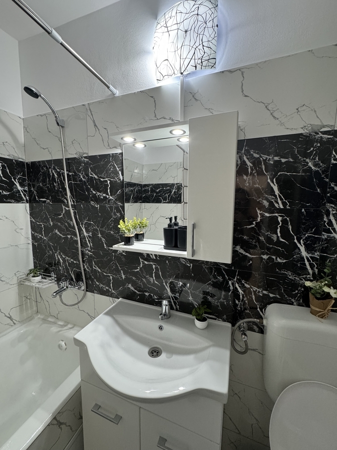 Interioare: zugraveli, glet, gresie–faianta, cabine dus, cazi baie, WC, chiuvete, parchet laminat, montat usi–ferestre, glafuri, sanitare, montat mobila.