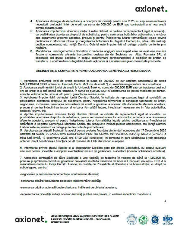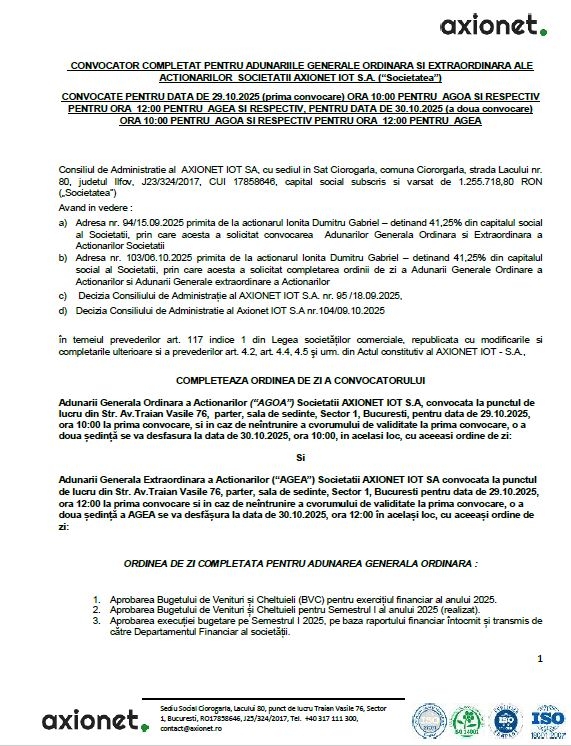 convocate pentru data de 29.10.2025 (prima convocare) ora 10:00 pentru AGOA si respectiv pentru ora 12:00 pentru AGEA si respectiv, pentru data de 30.10.2025 (a doua convocare) ora 10:00 pentru AGOA si respectiv pentru ora 12:00 pentru AGEA