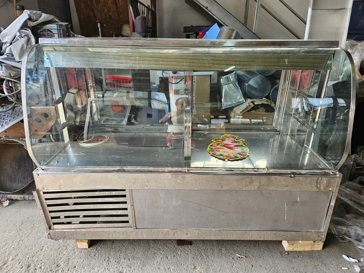 Vitrina carne cu geam bombat cu 2 polite si geamuri culisante la spate, 2000 x 800 x 1500 h mm.