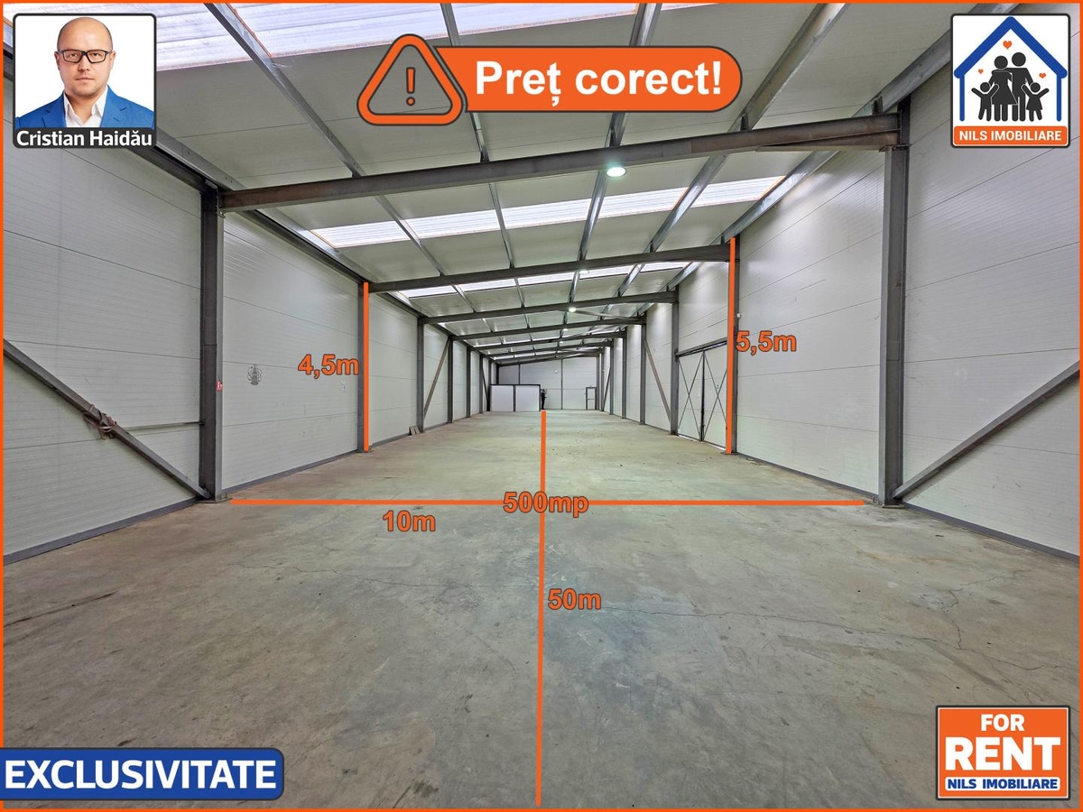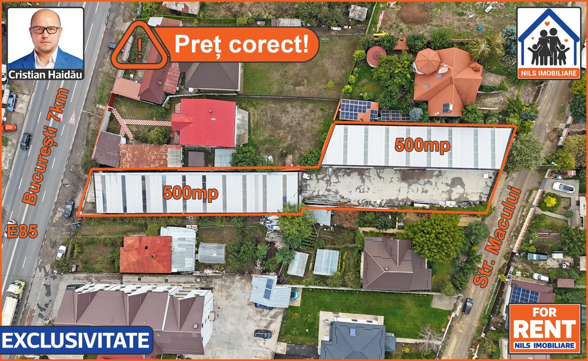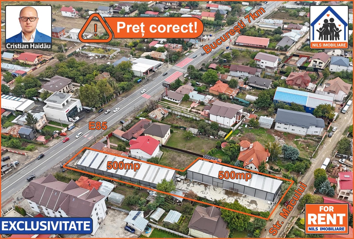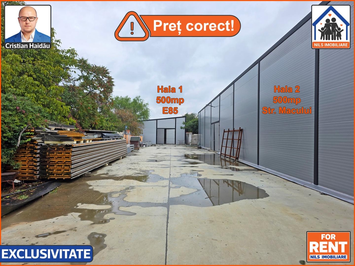 Ambele hale se inchiriaza cu 4000euro dar exista si posibilitatea inchirierii separate. Hala de la E85 se inchiriaza cu 4,5euro/mp = 2250euro iara hala din spate cu deschidere la strada Macului cu 3,5euro/mp = 1750 euro. /