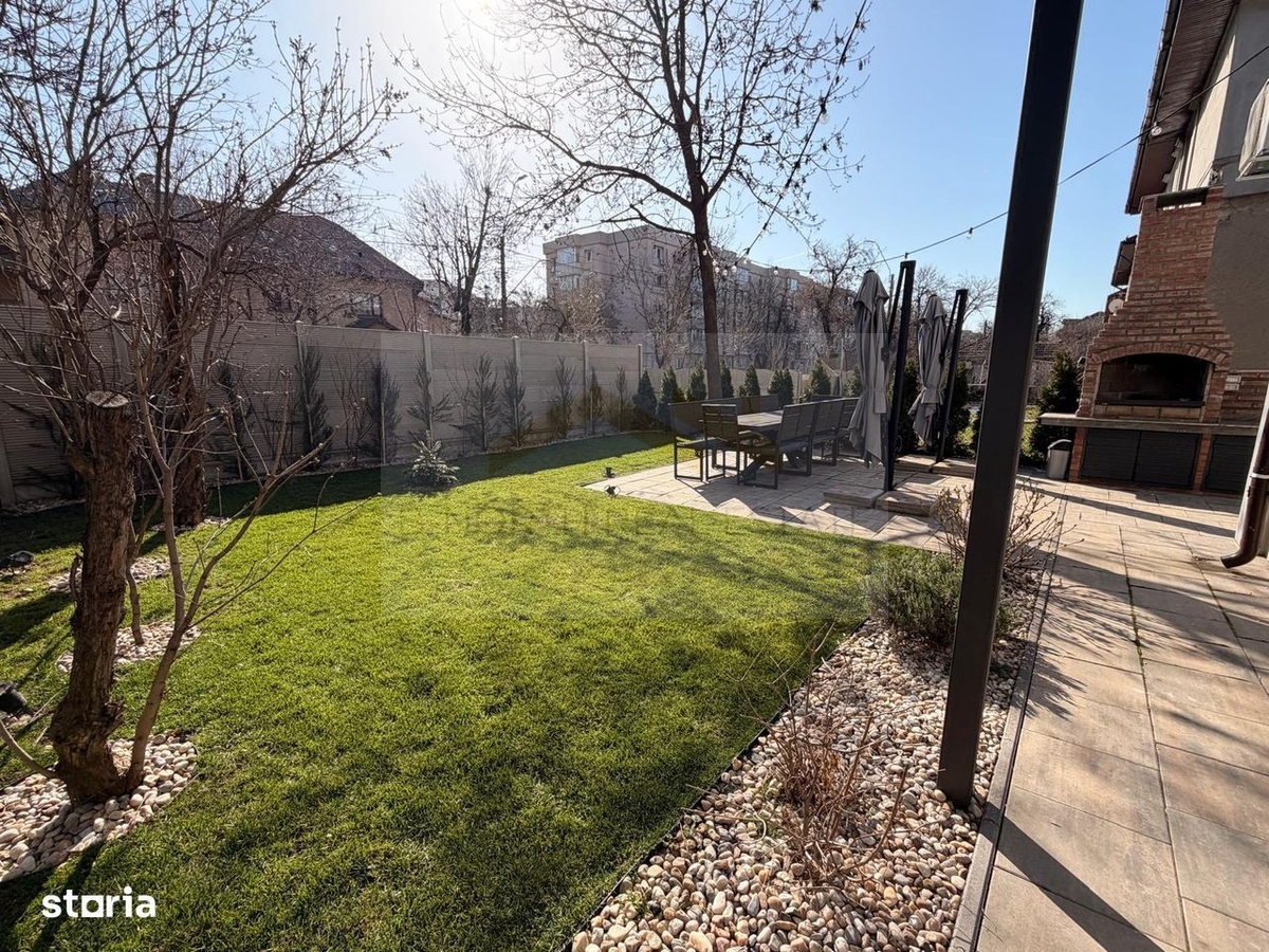 Locuinta impresioneaza prin curtea proprie de aproximativ 130 mp, amenajata cu gazon si arbori ornamentali, terasa spatioasa si gratar din caramida, fiind perfecta pentru relaxare sau socializare in aer liber.