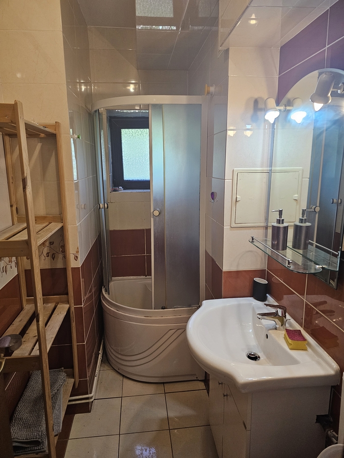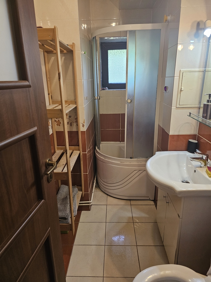 Baia are cabina de dus. Geam la baie.