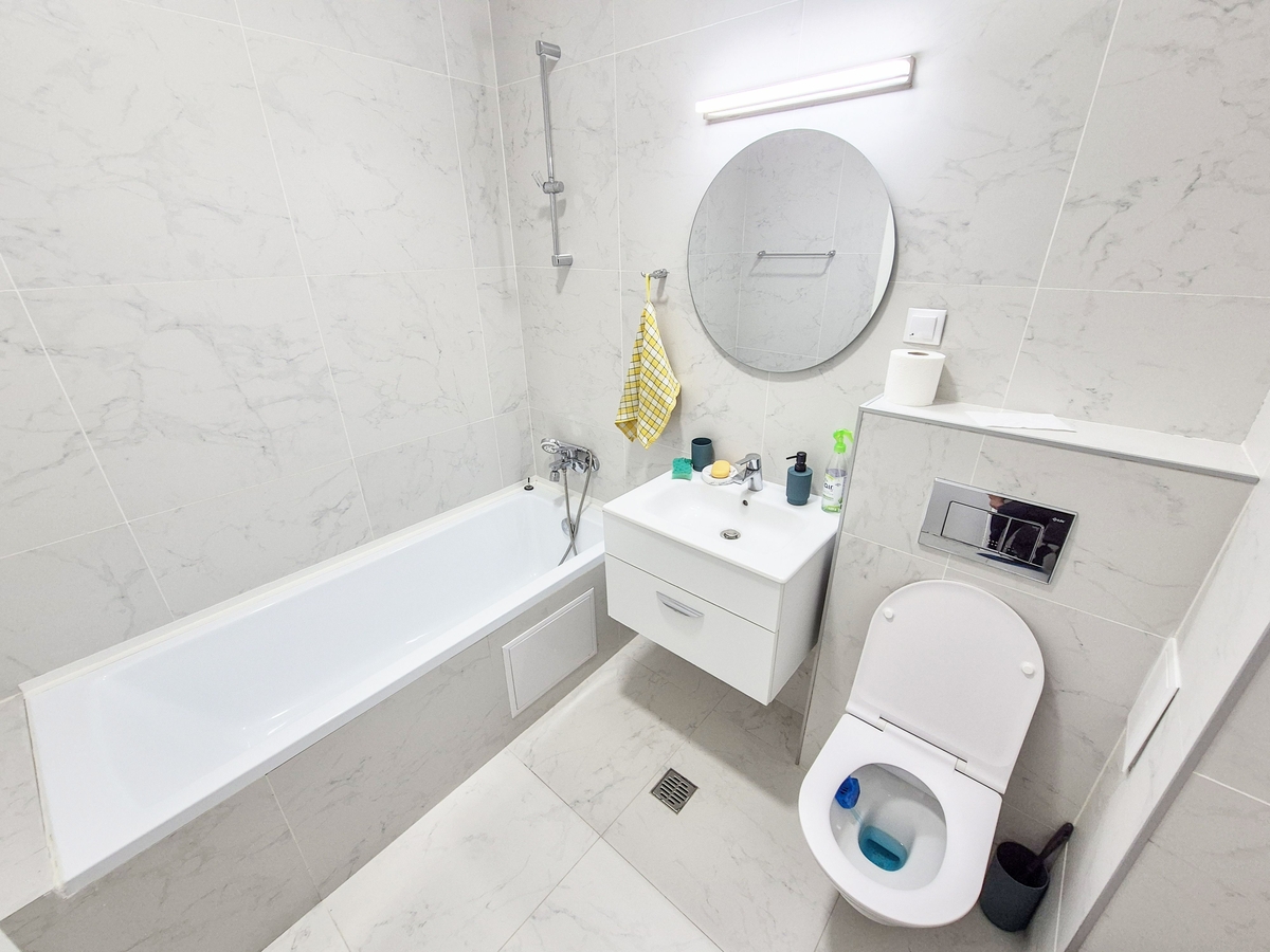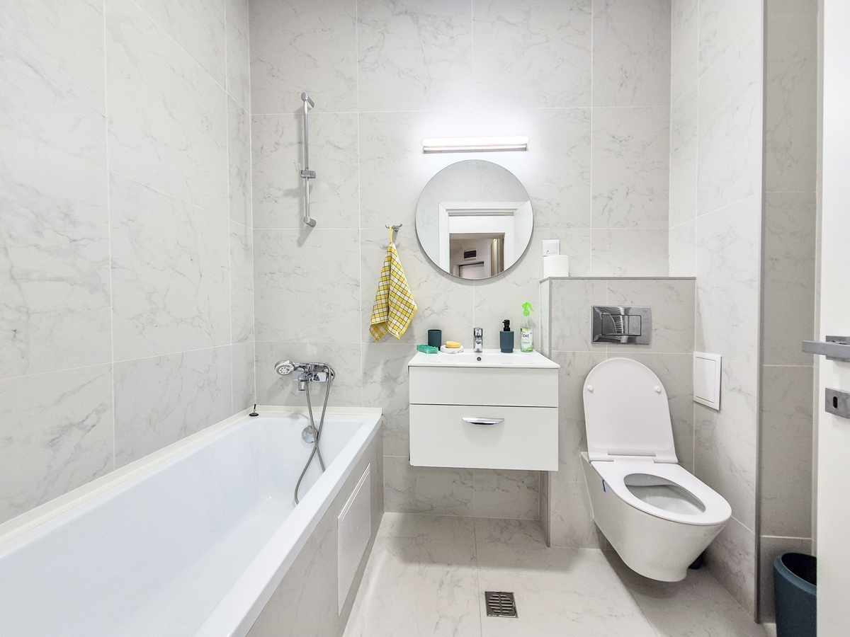 Va prezentam acest apartament cu 2 camere situat la etajul 5, din ansamblul rezidential Ivory Residence din Pipera. Apartamentul este complet utilat si mobilat, la prima inchiriere si are o suprafata utila de 67.05 mp + balcon de 5.15 mp