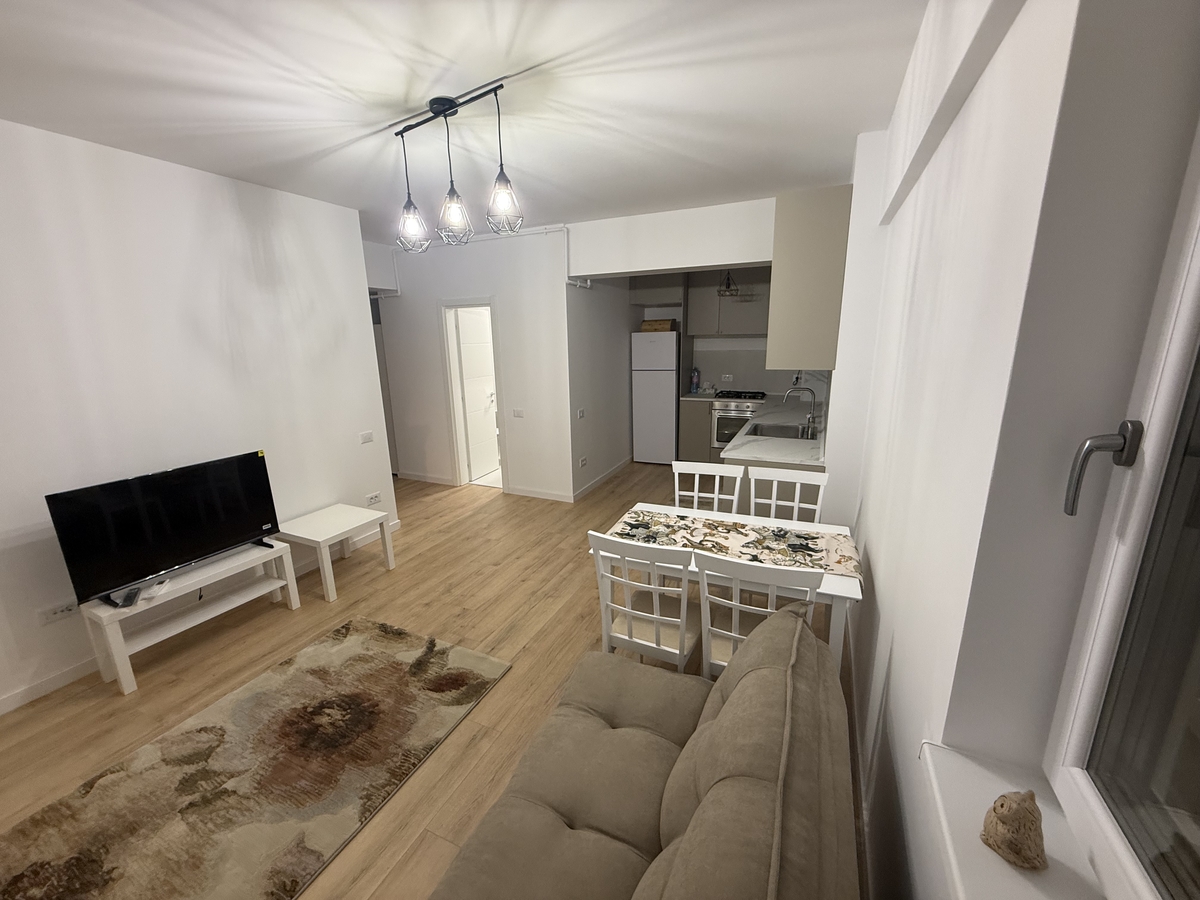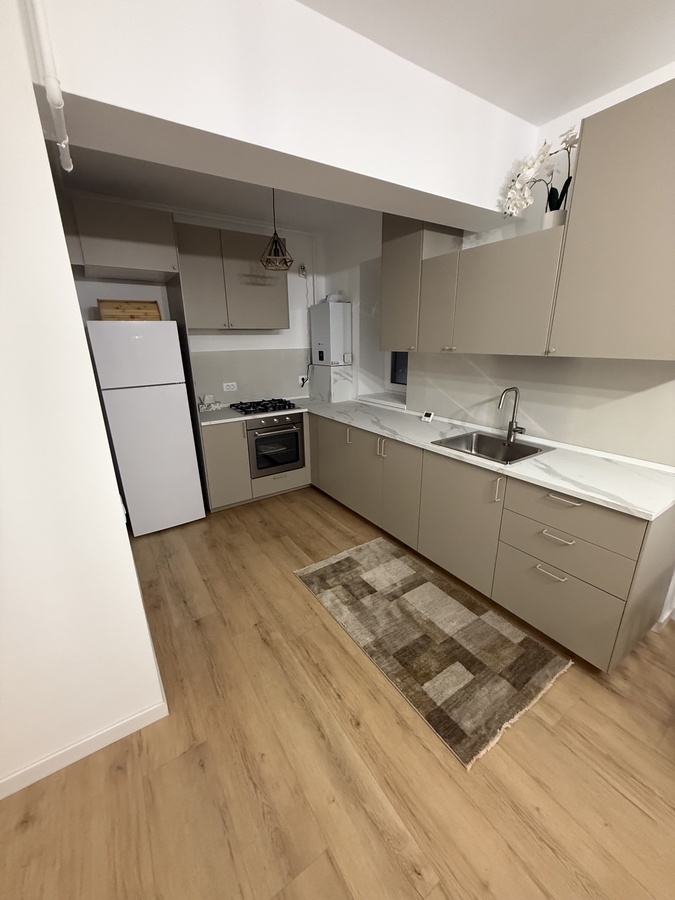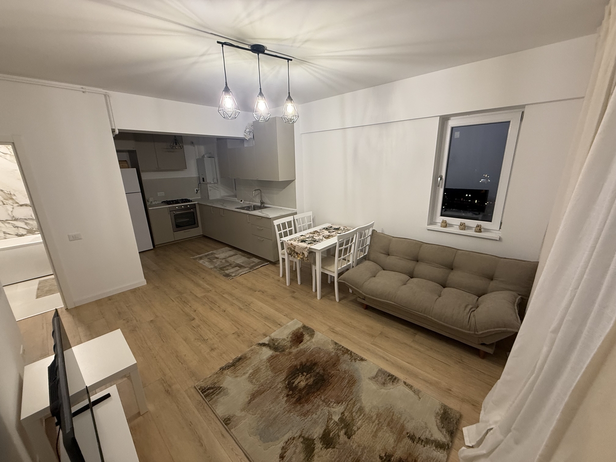 Apartament de 2 camere, decomandat, cu living open-space si terasa, este situat in complexul rezidential nou Veris Residence, in zona Titan, sector 3. Amplasat la etajul 10 al unui imobil cu 11 niveluri, apartamentul are 50 mp, beneficiaza de lumina naturala pe tot parcursul zilei. Locatia este excelenta, la doar 7 minute de mers pe jos de statia de metrou Costin Georgian si de Parcul IOR. Blocul a fost finalizat in iulie 2025, oferind cele mai noi standarde de confort si eficienta. Locuinta este complet mobilata si utilata cu mobilier nou Mobexpert si electrocasnice moderne, avand o compartimentare foarte practica, cu numeroase spatii de depozitare. Dotarile premium includ centrala proprie cu incalzire in pardoseala, aer conditionat dual inverter, geamuri Tripan, finisaje de calitate superioara. Bucataria este echipata cu plita cu gaz, cuptor electric, combina frigorifica, iar baia dispune de masina de spalat. Dormitorul are pat matrimonial 160x200, iar livingul este dotat cu o canapea extensibila.
