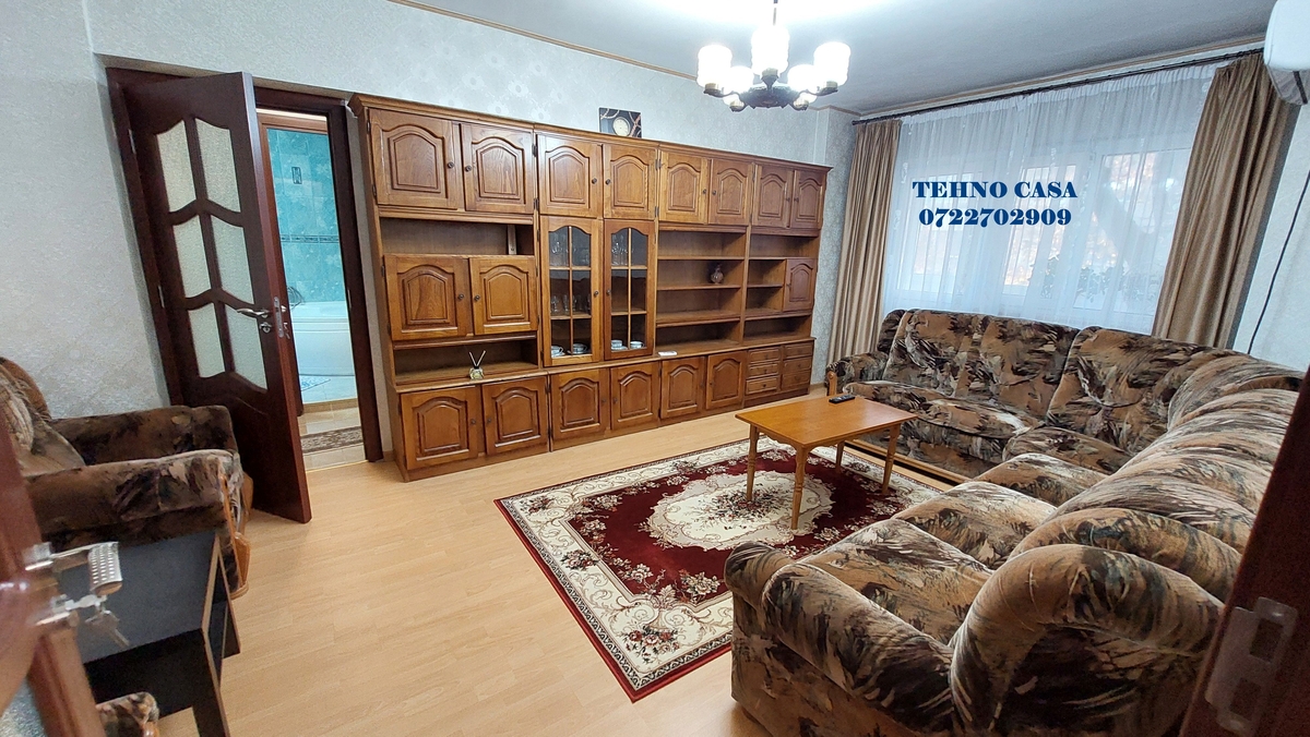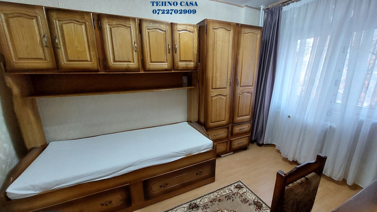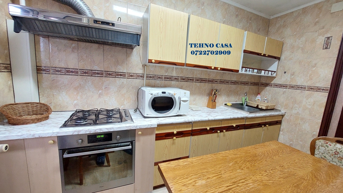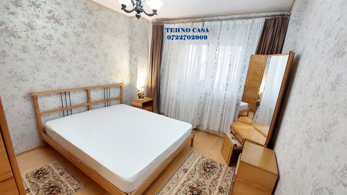 Bucataria este inchisa, mobilata si utilata complet (plita, cuptor, hota, frigider, etc), dormitorul mare este dotat cu pat matrimonial cu saltea noua, dulap haine spatios, in dormitorul mic este pat de 1 persoana cu saltea noua, biblioteca si birou, livingul are set canpea extensibila tip coltar si doua fotolii, biblioteca, televizor, etc., din sufragerie se iese in balcon (balcon spatios pe latimea sufrageriei si a dormitorului mare), baia mare este cu cada.