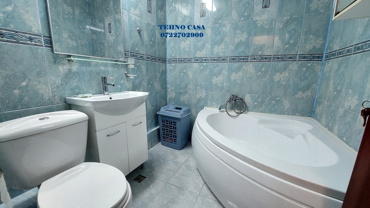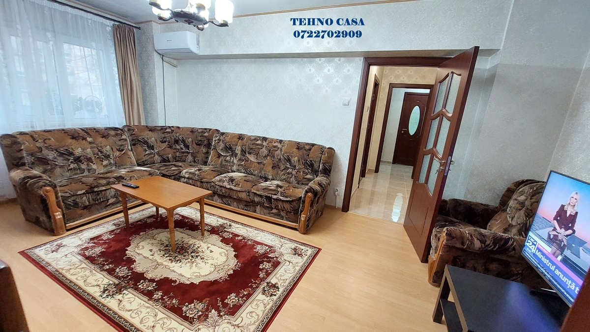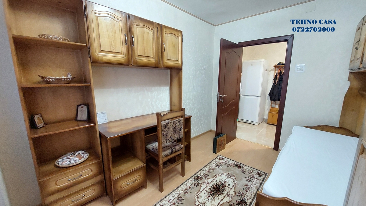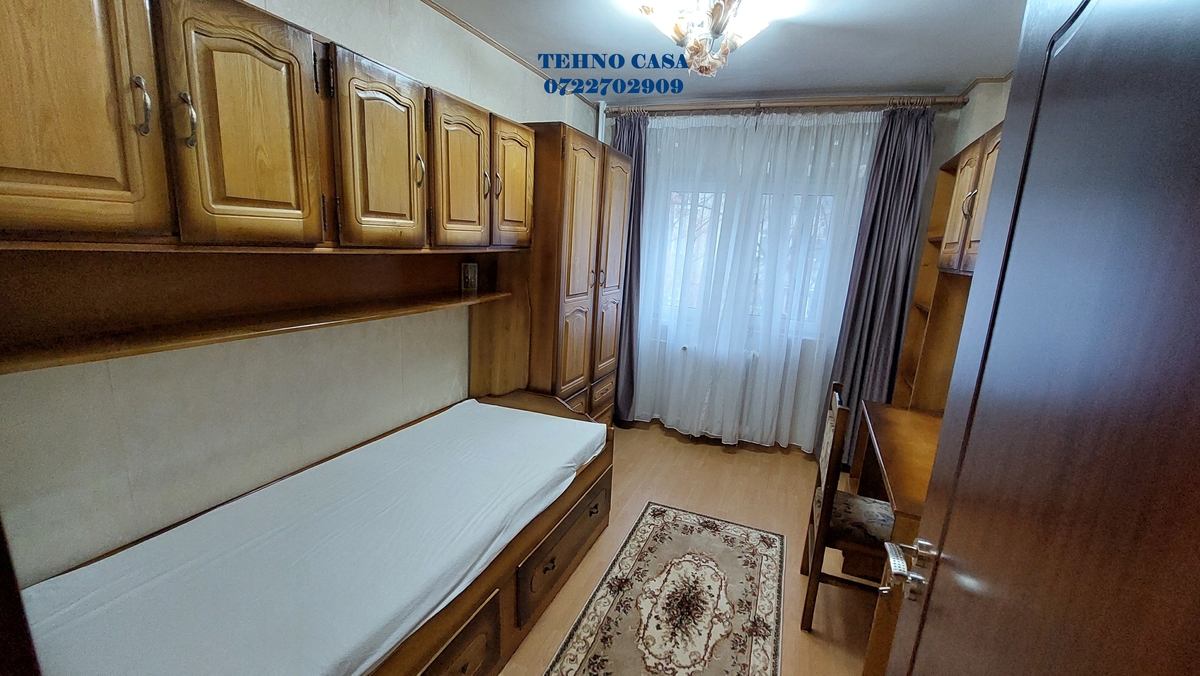 Bucataria este inchisa, mobilata si utilata complet (plita, cuptor, hota, frigider, etc), dormitorul mare este dotat cu pat matrimonial cu saltea noua, dulap haine spatios, in dormitorul mic este pat de 1 persoana cu saltea noua, biblioteca si birou, livingul are set canpea extensibila tip coltar si doua fotolii, biblioteca, televizor, etc., din sufragerie se iese in balcon (balcon spatios pe latimea sufrageriei si a dormitorului mare), baia mare este cu cada.