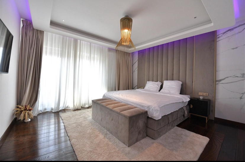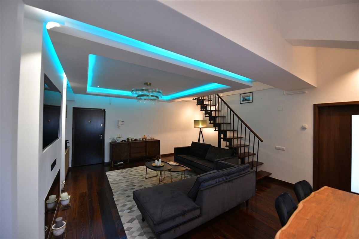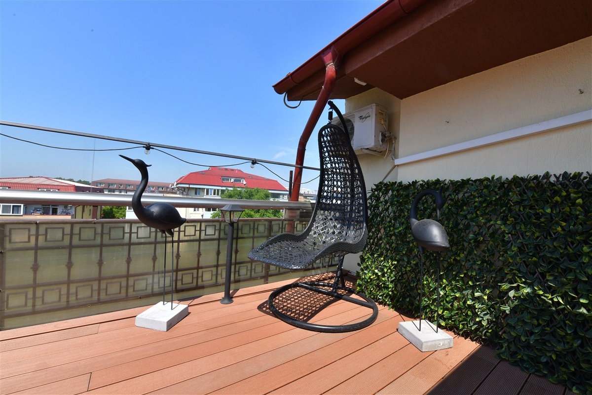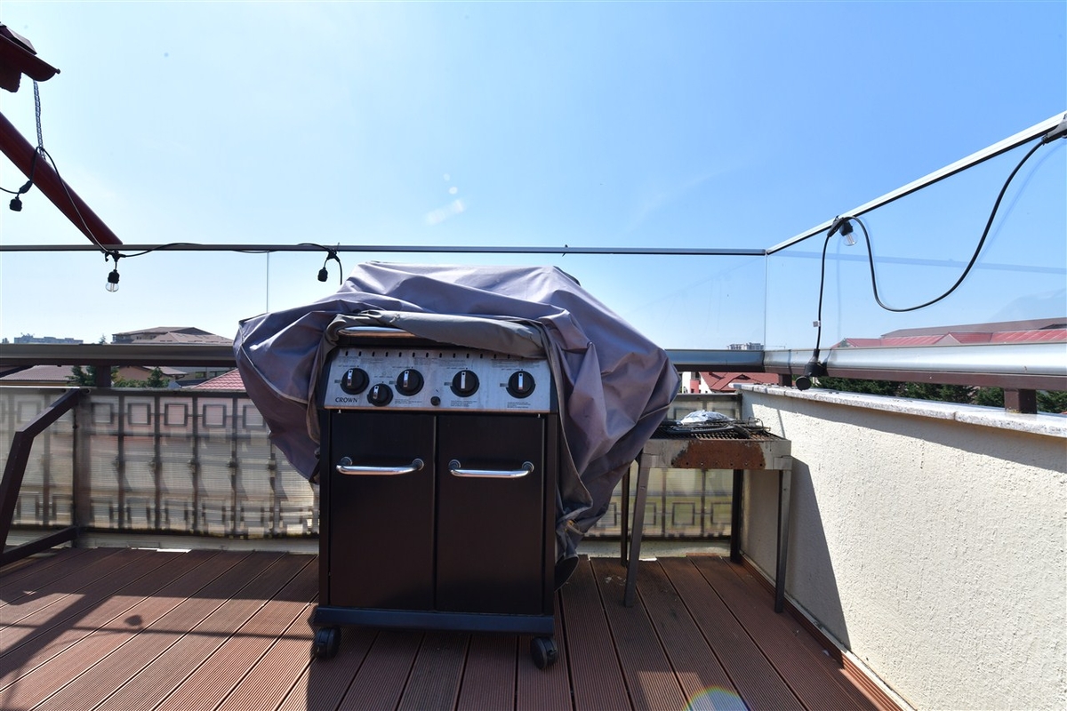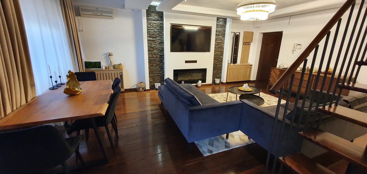 Penthouse, etaj 3 si mansarda, compus din 3 camere (living, dormitor, bucatarie si 1 gr. sanitar + dormitor, dressing room si 1 gr. sanitar, la ultimul etaj), an constructie 2010, mobilat modern, si utilat complet (masina de spalat vase, masina de spalat rufe, TV), in suparafa de 180 mp (impreuna cu o terasa generoasa de 59 mp), amenajat cu semineu, centrala proprie pe gaz, termopan, aer conditionat, parchet, usa metalica, loc amenajat pentru gratar/ barbeque grill, + sezlonguri si balansoar, 2 locuri de parcare (subteran).