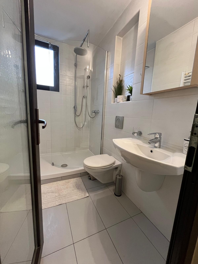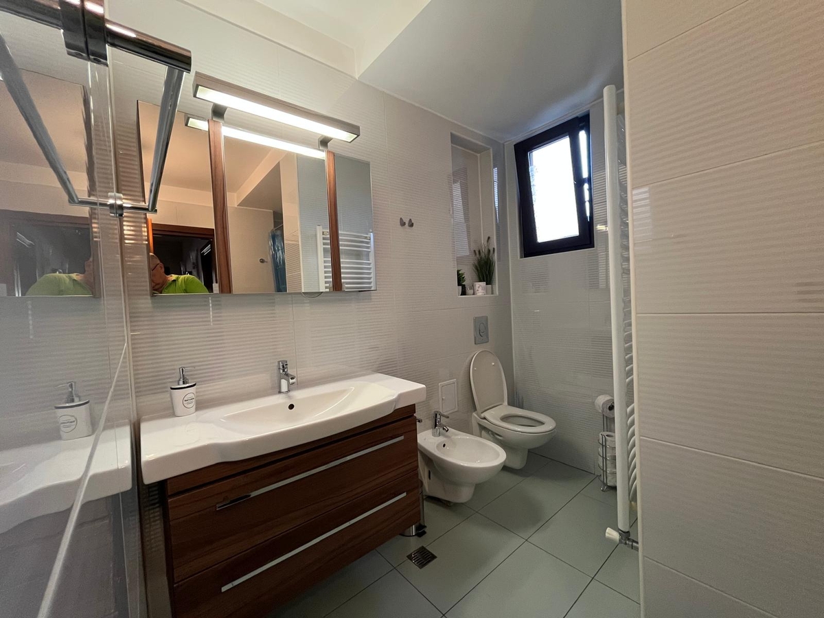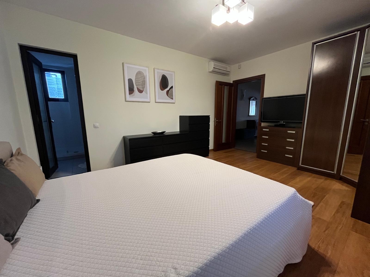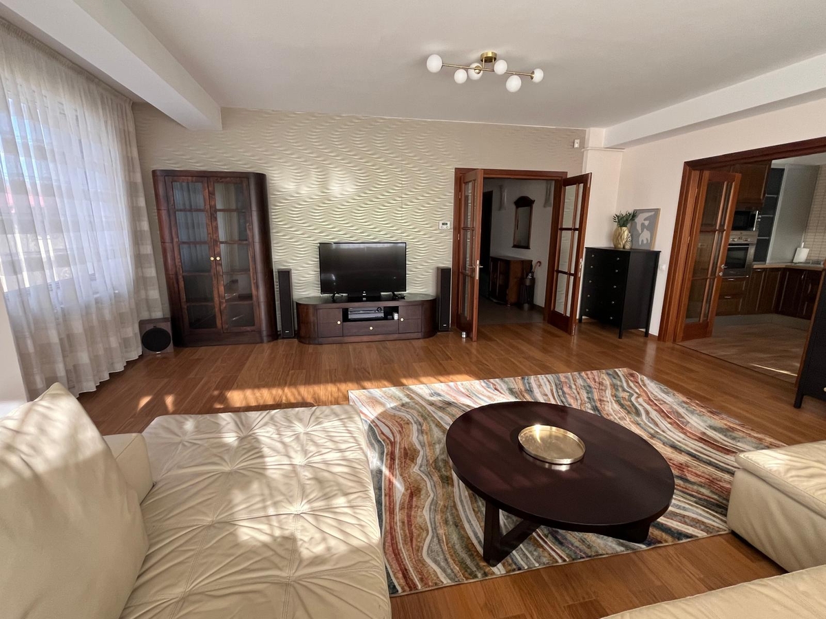 Apartamentul are 3 camere, living si 2 dormitoare, ambele dormitoare cu pat matrimonial, 2 bai, balcon, este decomandat si are o suprafata totala utila de 110 mp. Este mobilat si utilat modern cu bucatarie mobilata si utilata complet (inclusiv masina de spalat vase), dispune de centrala proprie de apartament cu zone de incalzire in pardoseala, aer conditionat in fiecare camera, televizoare, parchet, jaluzele electrice, interfon, treptele de la intrare incalzite, loc de parcare la demisol cu rampa garajului avand o panta foarte mica si incalzita plus locuri de parcare pe strada in fata imobilului.