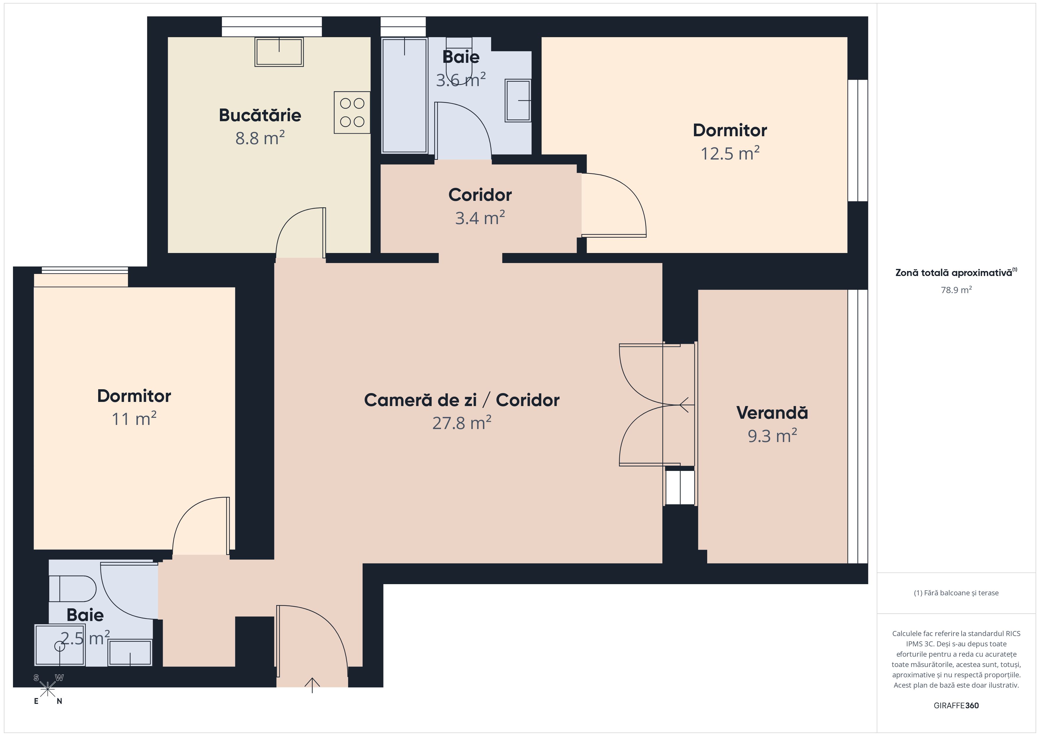 - Compartimentare: living spatios, bucatarie inchisa, doua dormitoare, doua bai si balcon