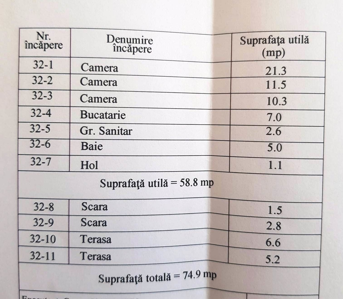 Va prezentam un apartament de 3 camere format din bucatarie, living si baie de serviciu la etajul 3 si 2 dormitoare + baie la etajul 4, suprafata totala 74.90 mp, suprafata utila 58.8 mp, terasa la etajul 3 de 6.6 mp, terasa et. 4, 5.2 mp, liber,