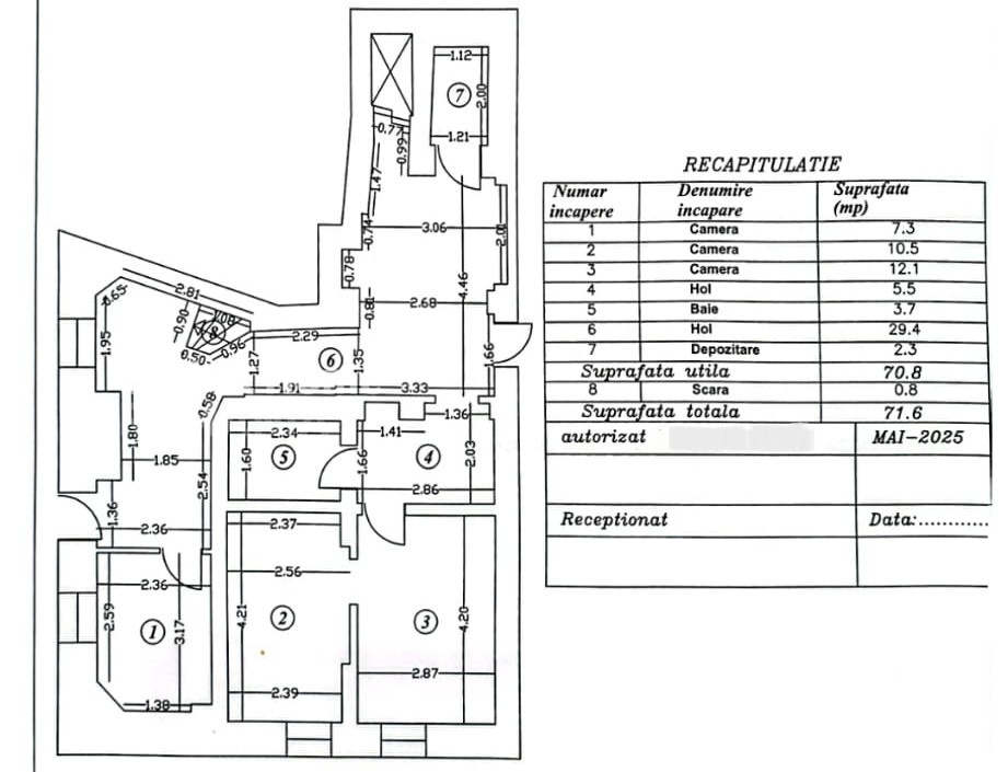Spatiul are o suprafata utila totala de 70,8 mp si este compus din cinci camere (incaperile 1–5 conform planului), completate de un hol de acces comun (incaperea 6) care asigura circulatia facila catre zonele de la etaj. Compartimentarea este practica si functionala, cu incaperi bine proportionate si ferestre care ofera lumina naturala si posibilitate de aerisire.