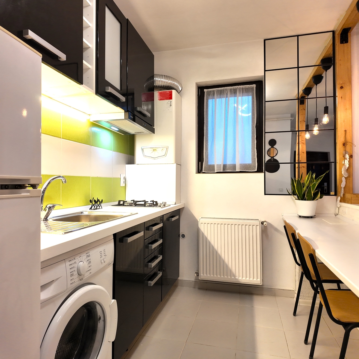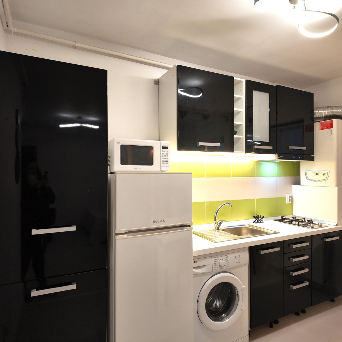 Este complet utilata cu electrocasnice: TV, frigider, aragaz, cuptor cu microunde, hota, masina de spalat, aspirator si fier de calcat. Baia este dotata cu cada si bideu.