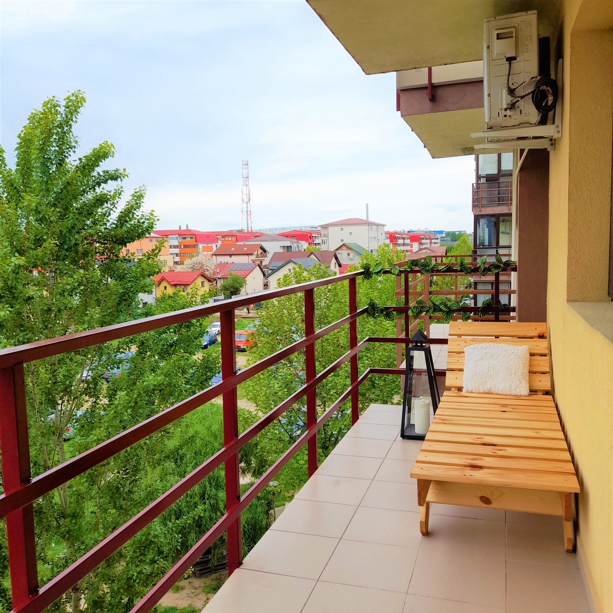 Garsoniera beneficiaza de un balcon generos, ideal pentru relaxare, amenajat cu fotoliu de exterior, zona de luat masa si jardiniere.