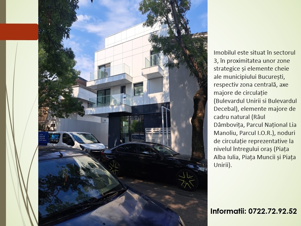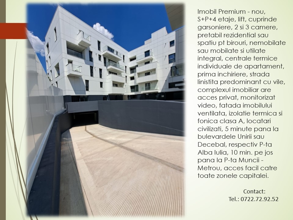 Imobil Premium - nou, de 4 etaje, cu lift, cuprinde garsoniere, 2 si 3 camere, pretabil rezidential sau spatiu pt birouri, nemobilate sau mobilate si utilate integral, centrale termice individuale de apartament, prima inchiriere, strada linistita predominant cu vile, complexul imobiliar are acces privat, monitorizat video, fatada imobilului ventilata, izolatie termica si fonica clasa A, locatari civilizati, 5 minute pana la bulevardele Unirii sau Decebal, respectiv P-ta Alba Iulia, 10 min. pe jos pana la P-ta Muncii - Metrou, acces facil catre toate zonele capitalei.