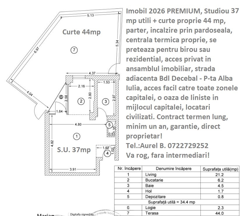 Proprietar, prima inchiriere, garsoniera 37 mp utili + curte proprie 44mp, parter din 4, centrala proprie, incalzire prin pardoseala, amenajata modern, nemobilata sau mobilata, se preteaza atat pentru birou cat si pentru locuit. Termen lung, contract minim un an. Imobil Premium - nou, mixt, 4 etaje, lift, strada linistita predominant cu vile, complexul imobiliar are acces privat, monitorizat video, fatada imobilului ventilata, izolatie termica si fonica clasa A, locatari civilizati, 5 minute pana la bulevardele Unirii sau Decebal, respectiv P-ta Alba Iulia, 10 min. pe jos pana la P-ta Muncii - Metrou, acces facil catre toate zonele capitalei. Va rog fara intermediari! Multumesc pentru interesul acordat si nu ezitati sa ma contactati pentru detalii suplimentare!