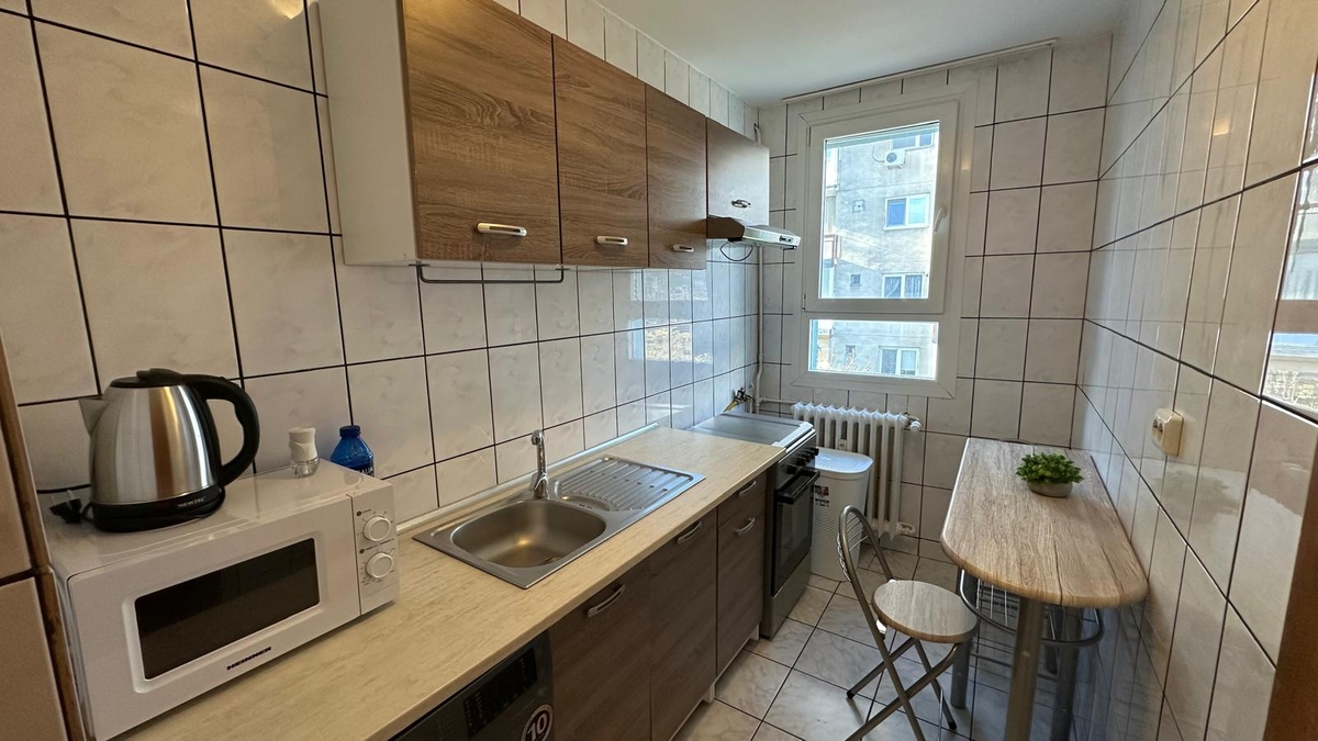 Kaufland, garsoniera de inchiriat, situata le etajul 4, confort 1, decomandata, libera, mobilata si utilata, bloc stradal, reabilitat termic, la 2 minute de metrou.