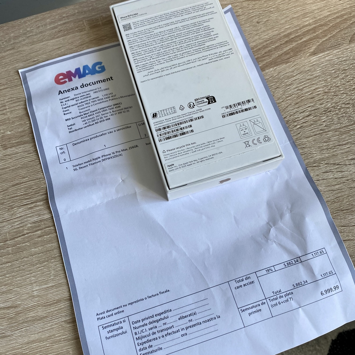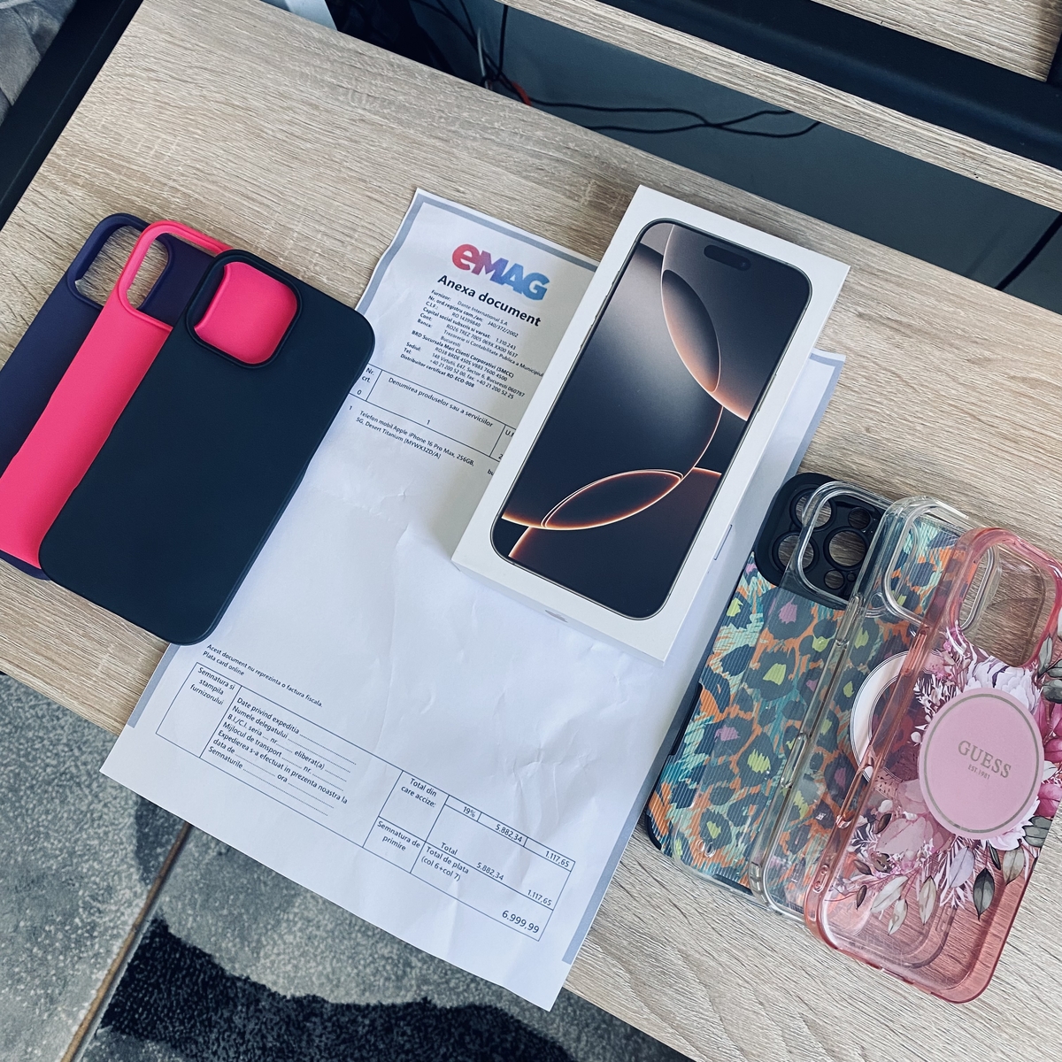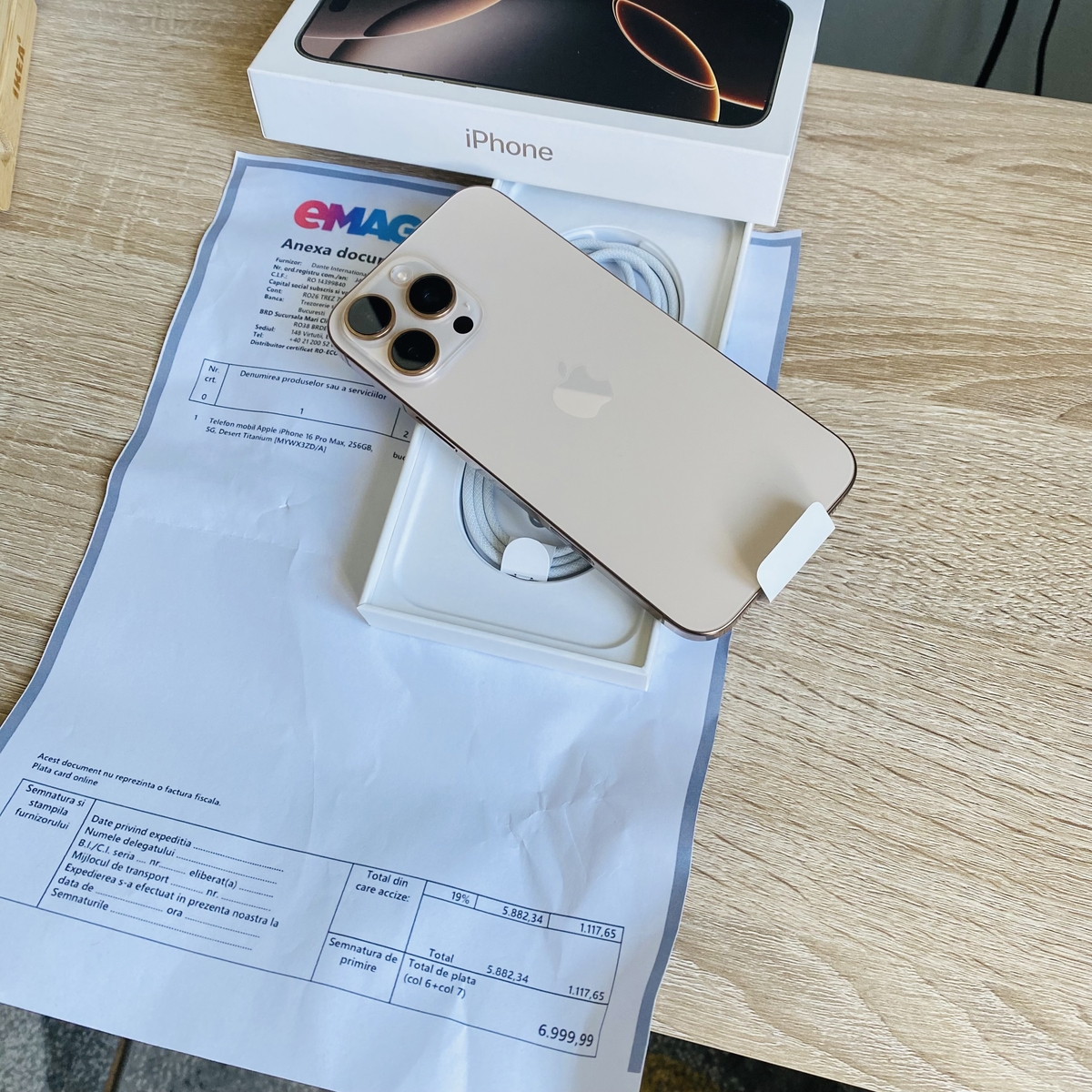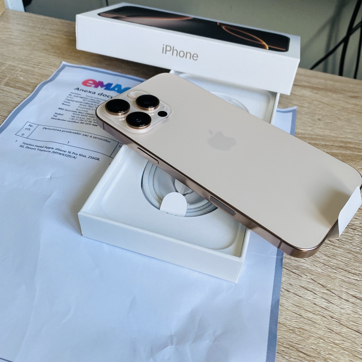 Vand iPhone 16 Pro Max, 256 GB, culoare Desert Titanium, LIBER retea, cumparat de la eMAG (ofer factura document autentic), la cutie pachet complet, bonus 7 huse de calitate + o folie display (valoare bonus 300 lei).
