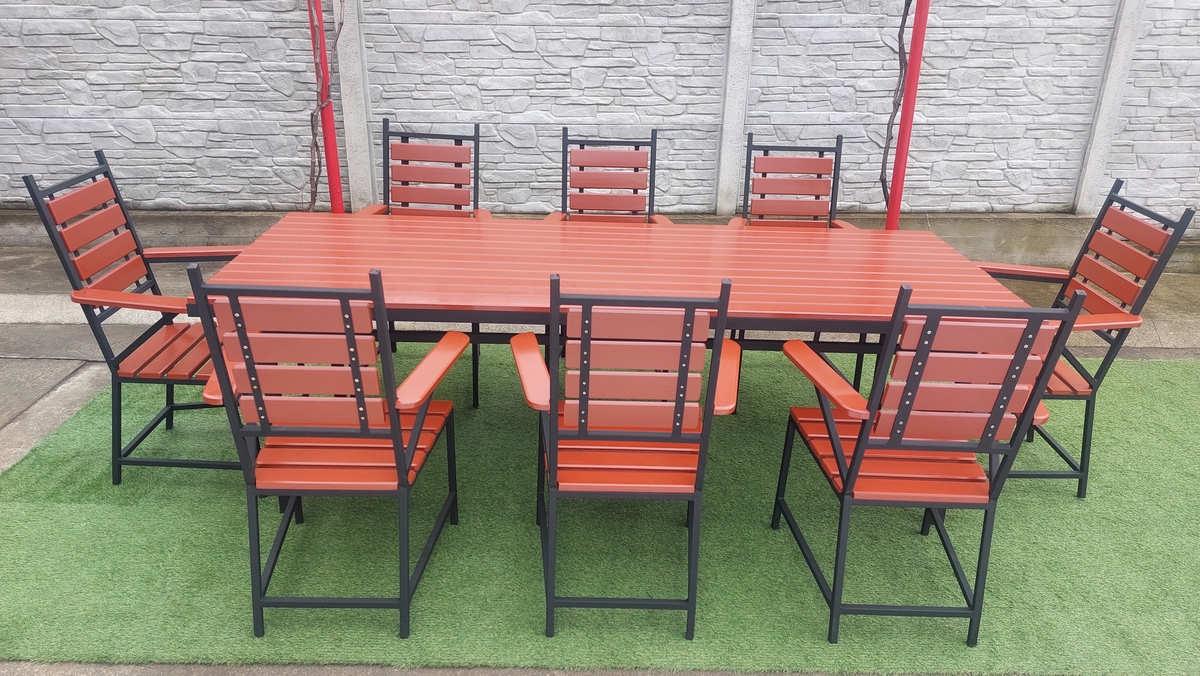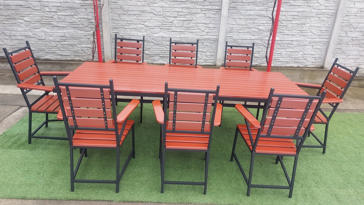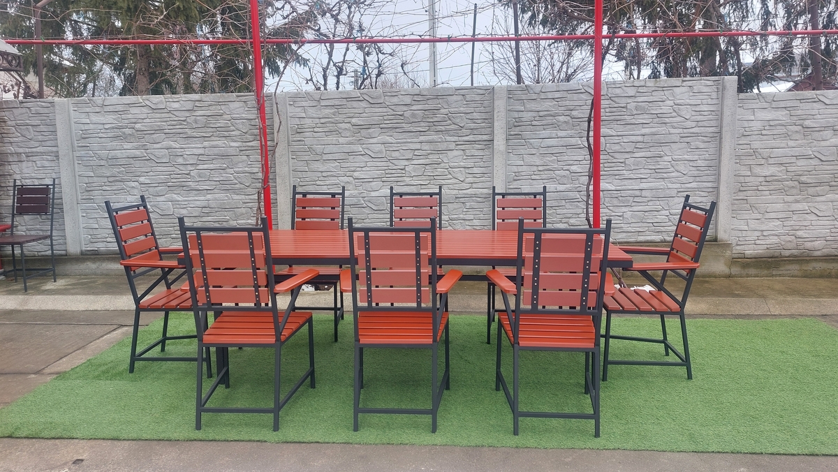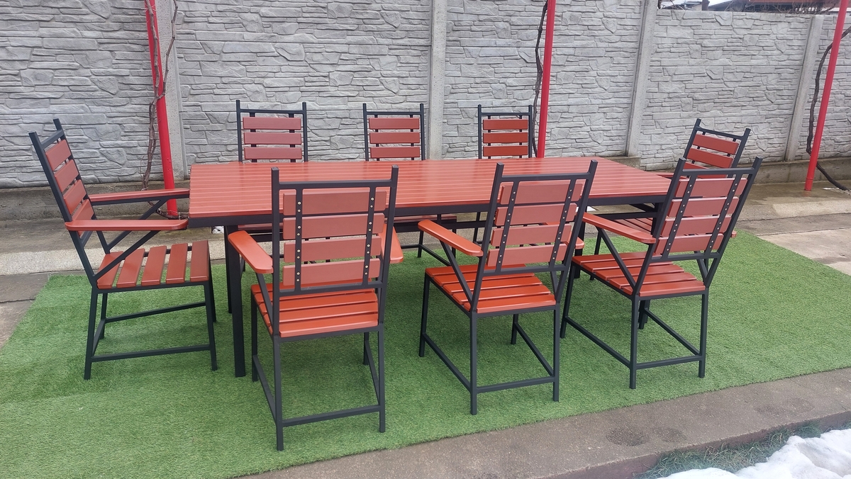 Masa (2400×900mm) si 8 scaune cu cotiere, fier negru, lemn maro roscat.