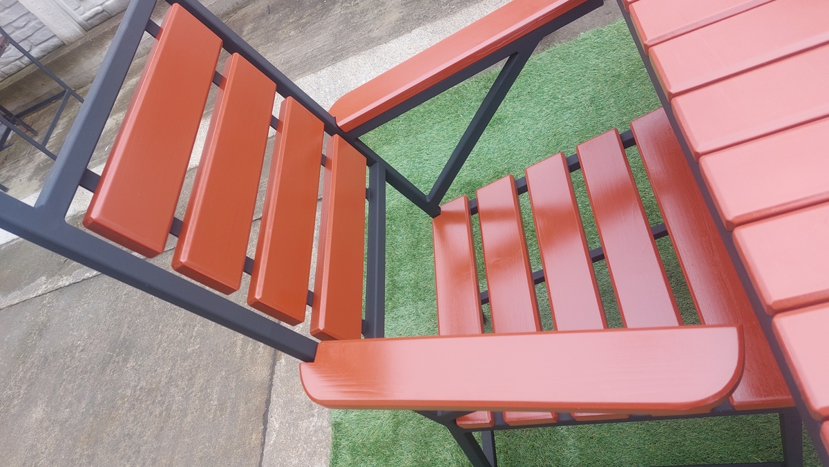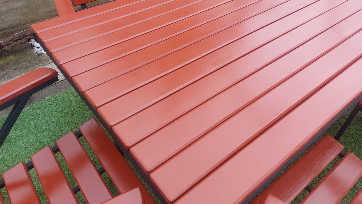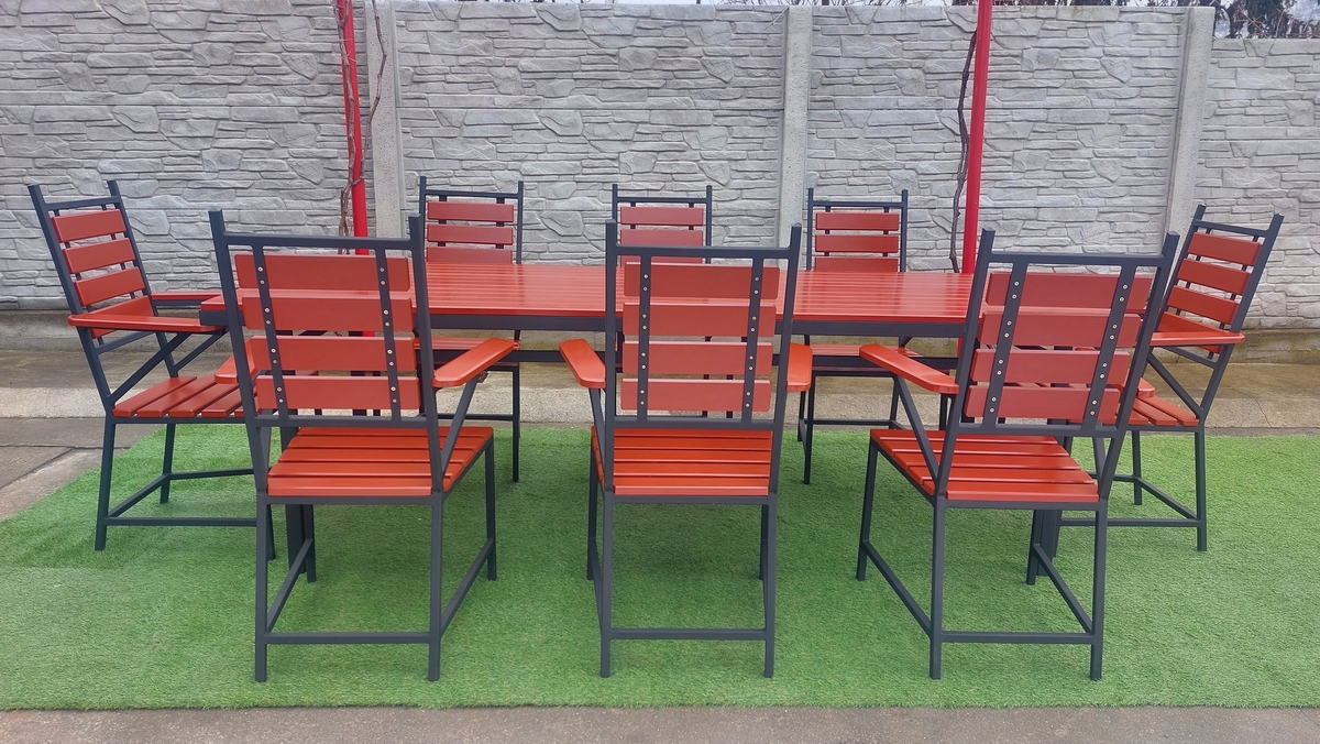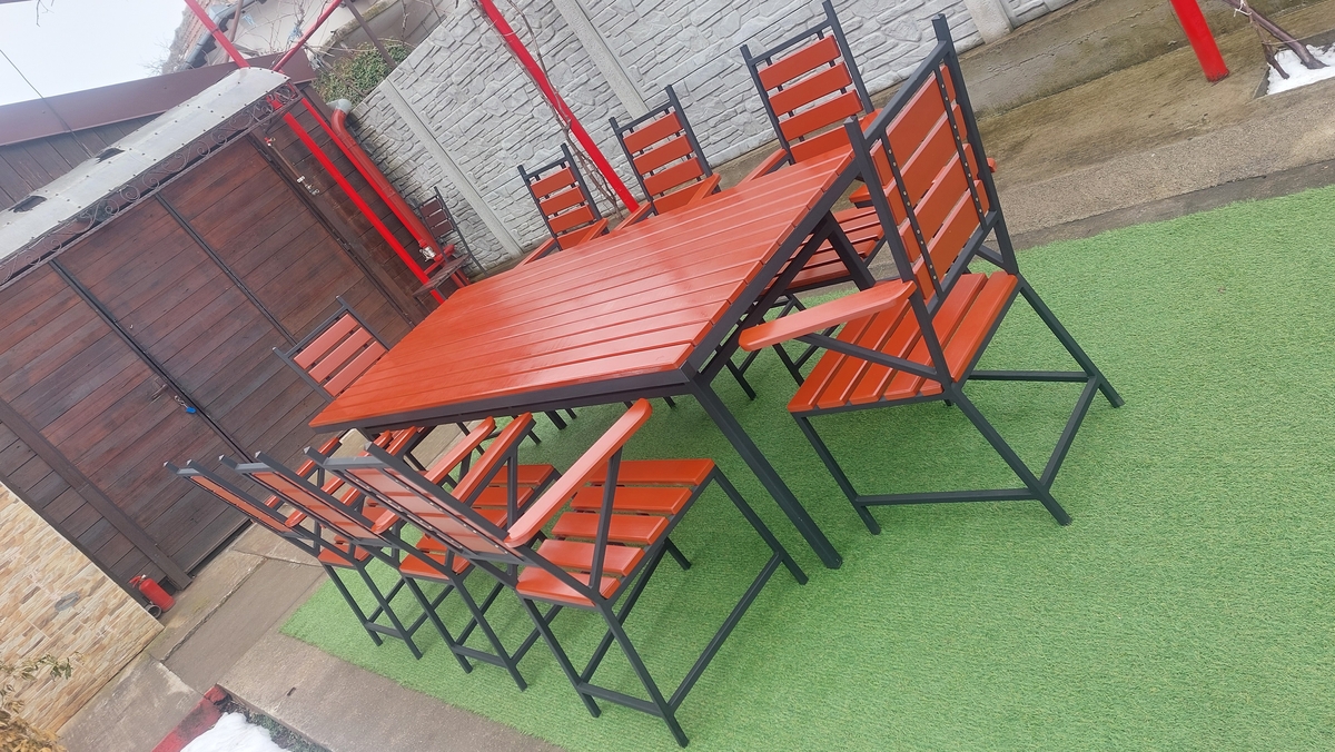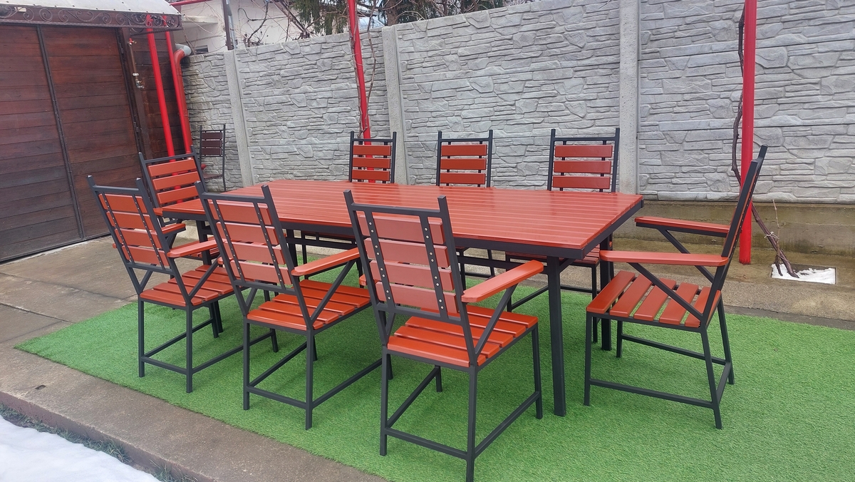 Masa (2400×900mm) si 8 scaune cu cotiere, fier negru, lemn maro roscat.