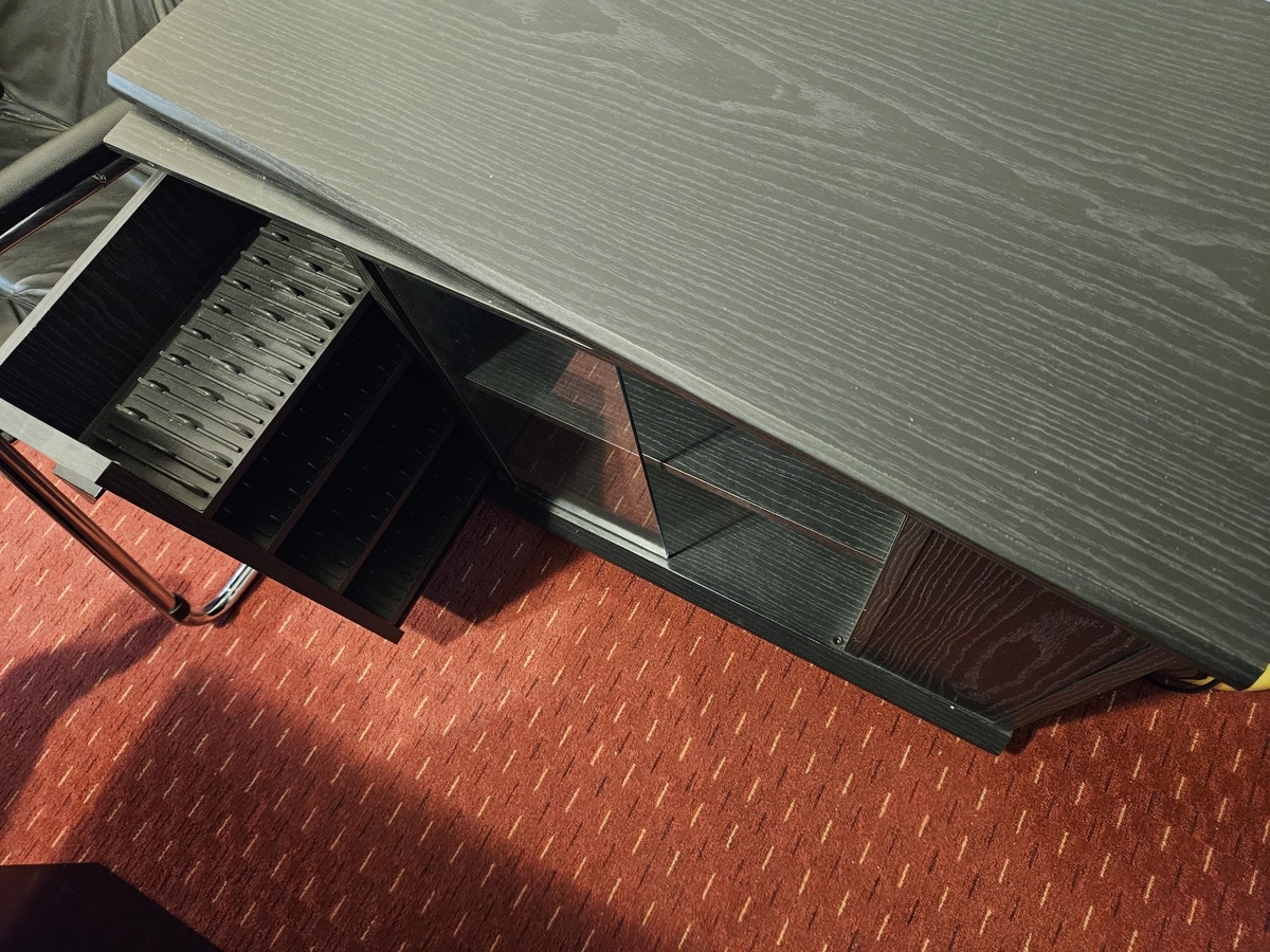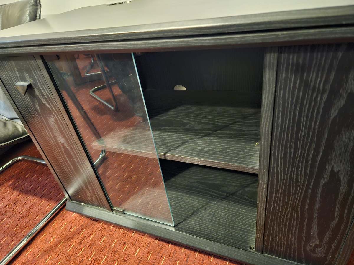 Masa televizor culoare neagra, cu sertare pozitionate pe mijloc si lateral.