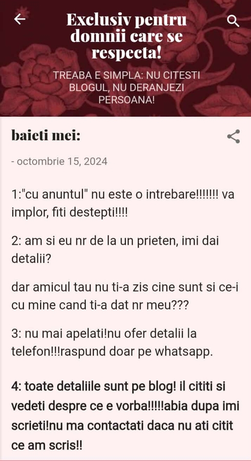Te roog sa citesti cu atentie si sa nu ma apelezi! Raspund doar pe whatsapp!