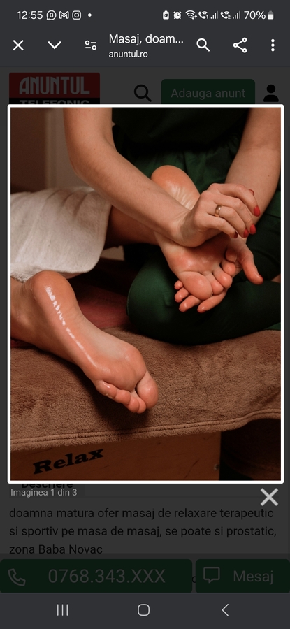 Buna! Ma numesc Ana, sunt o doamna selectiva, curata, educata si cu bun simt. blonda cu ochii albastri, slim, 1,65. Ofer masaj de relaxare pe tot corpul, cervical, lombar, reflexoterapie si inghinal domnilor manierati si generosi 35 ani+/ 50 min, 300 ron.Program: Luni-Duminica/orele: 10-20. Programarile se fac cu 1 ora inainte si confirmarea sau anularea programarii 30 min inainte.Nu accept persoane in stare de ebrietate sau sub influenta altor substante. Ofer si cer igiena maxima cu dus obligatoriu inainte. Nu fac deplasari si nu sun videocall, poze reale. Nu ofer companie intima. Nu pot raspunde tot timpul la tel asa ca va astept cu drag si pe Whatsapp pt mai multe detalii! Bulevardul 1 Decembrie, sector 3.