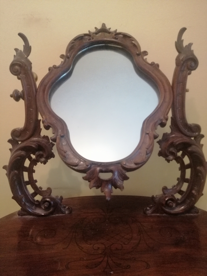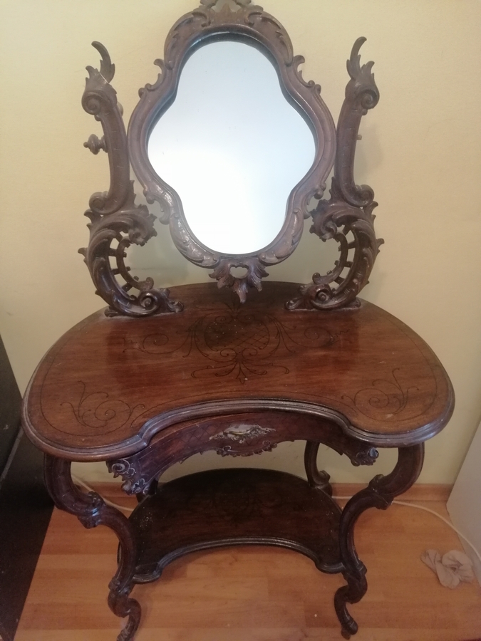 Masuta de epoca din lemn sculptata (stil toaleta), vechime cca 90 ani, cu oglinda si sertar.