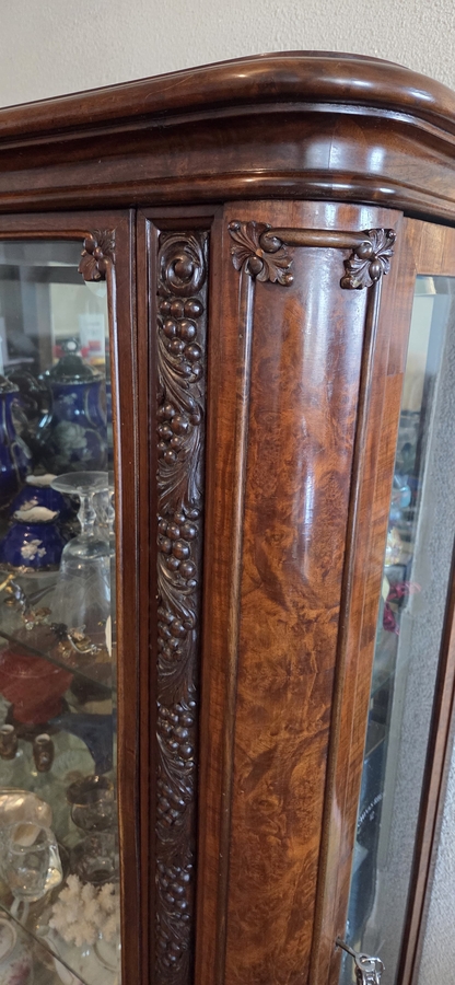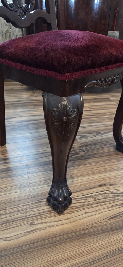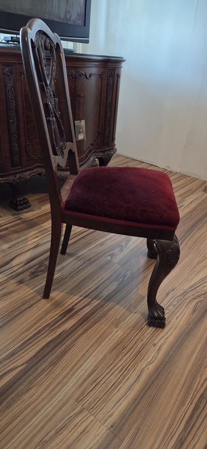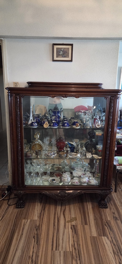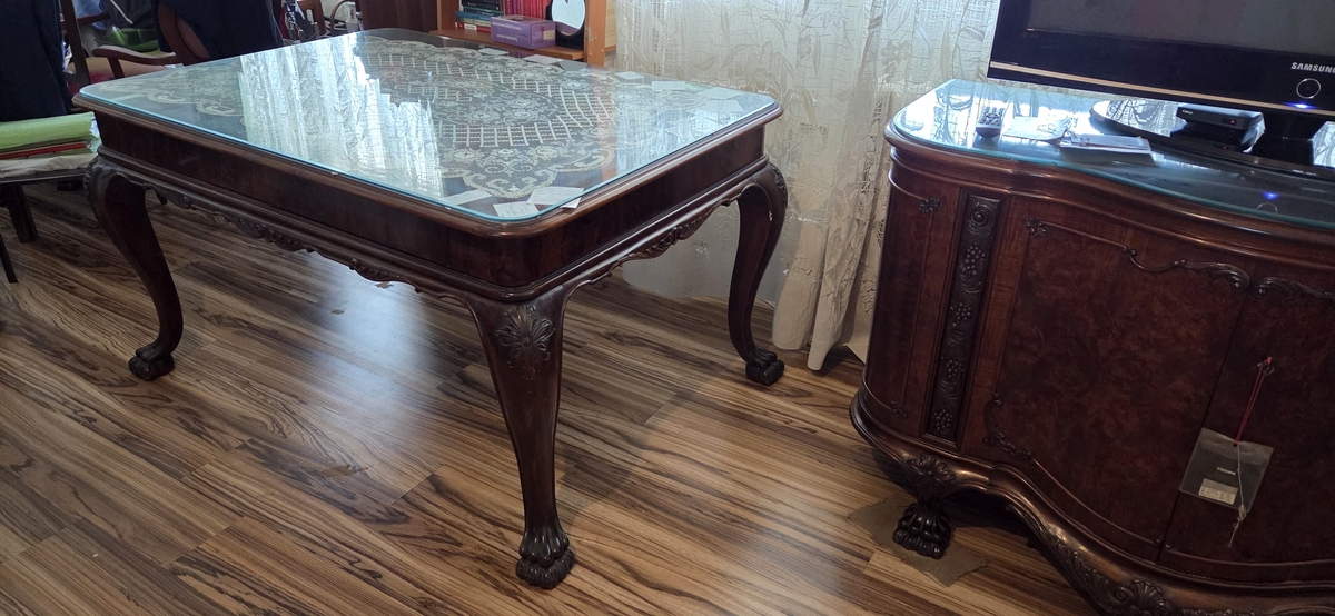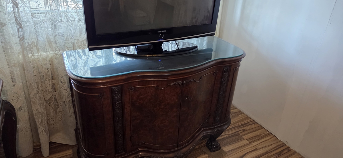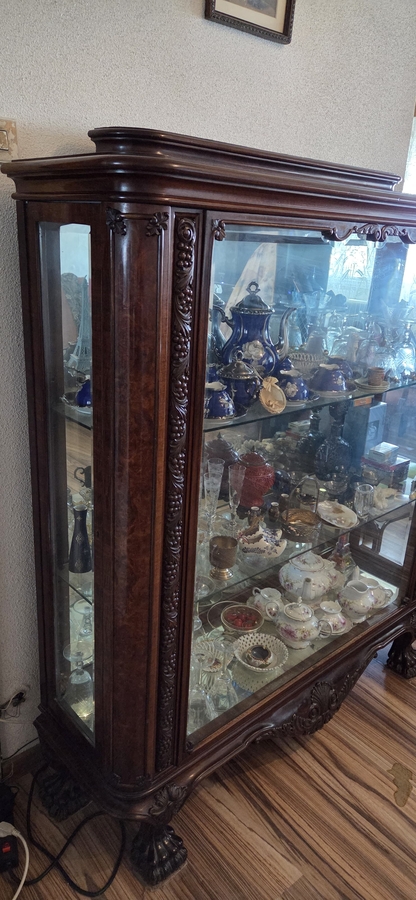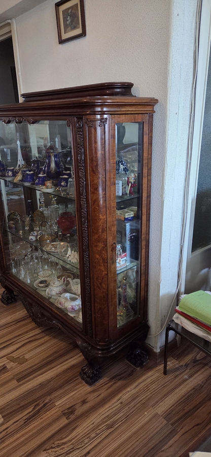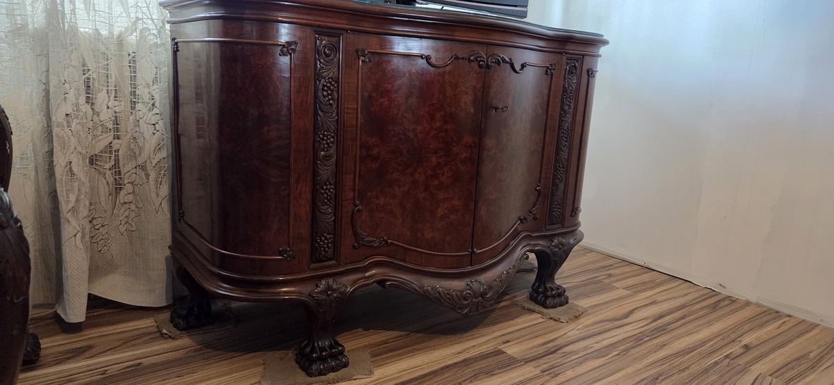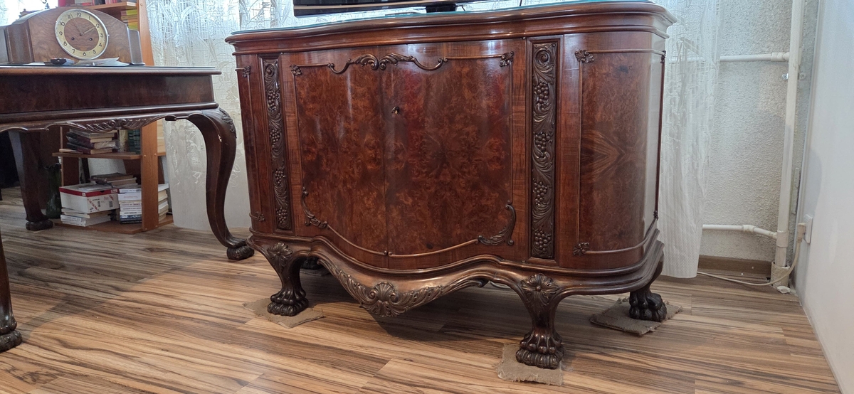 Mobila lemn cires, cuprinde vitrina, doua servante , una cu doua usi, una cu patru usi, masa si scaune. Scaunele necesita reparatii.
