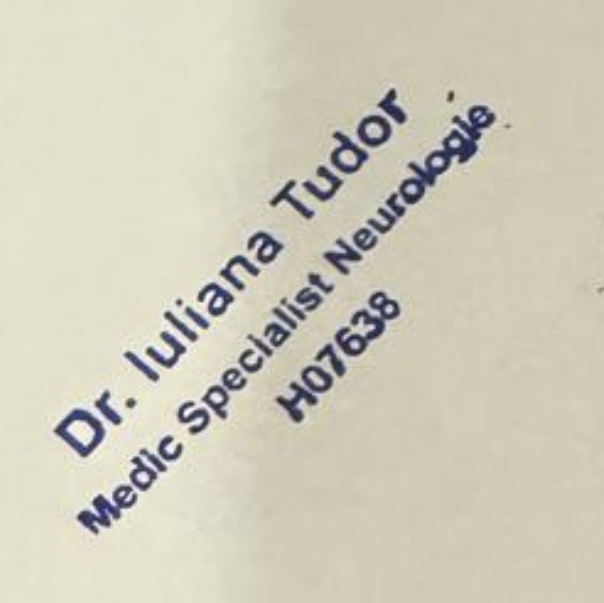 Declar pierduta/furata parafa de medic specialist neurologie, Dr. Tudor Iuliana, cod parafa H07638, din data de 10.02.2026, cu amprenta din imagine. O declar nula.