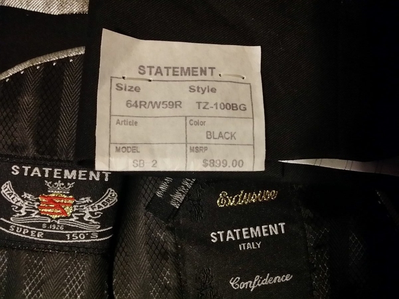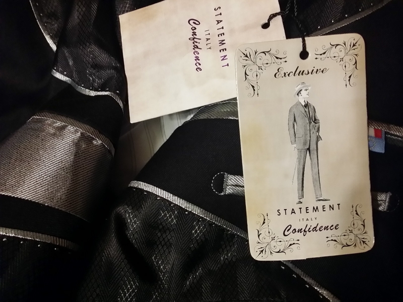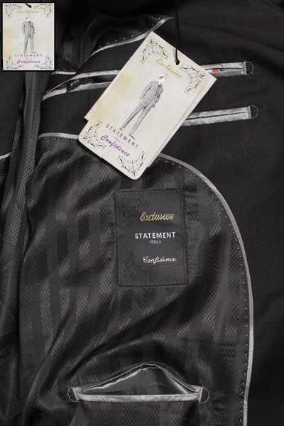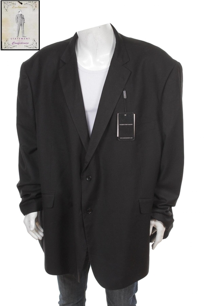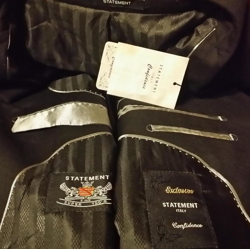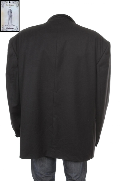 Confidence Statement Italy Suit model, 2 nasturi, intre umeri 64 cm, piept/ burta 168 cm, lungime 85 cm, maneca exterior 70 cm si interior 45 cm. negru, produs nou, sigilat, eticheta