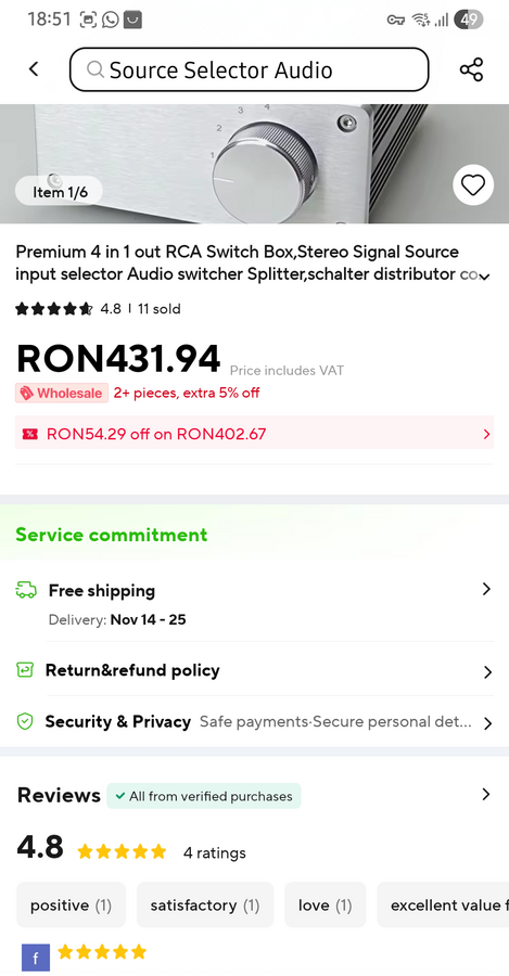 Selector HI-FI pentru comutarea diferitelor surse audio. L-am cumparat de pe Aliexpress. Pur si simplu am selectat gresit produsul si din pacate n-am reusit sa-l returnez. Aveam nevoie de cu totul altceva.
