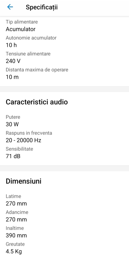 Stare perfecta aproape noua fara nici o zgarietura, se aude foarte tare pentru o camera, ca accesorii telecomanda si microfon nefolosite deloc noi ca in prima zi, se vinde in cutia originala, mai multe detalii de boxa in poze uitati-va va rog, predare personala in Bucuresti, neg.