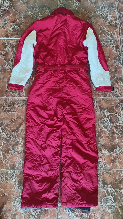Vand costum schi culoare rosu- grena sidefat, cu gluga. Costumul arata excelent, purtat o singura data. Este prevazut cu fermoar longitudinal pentru o imbracare mai usoara, si cu doua buzunare laterale cu fermoare. Are dublura prevazuta cu elastic in zona gleznei pentru a nu lasa sa patrunda zapada. Toate fermoarele functioneaza corect.