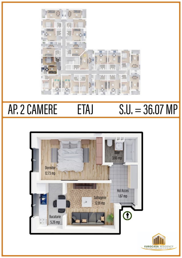 Eurocasa Residence iti prezinta spre vanzare un studio frumos compartimentat, in cartierul Militari Residence.