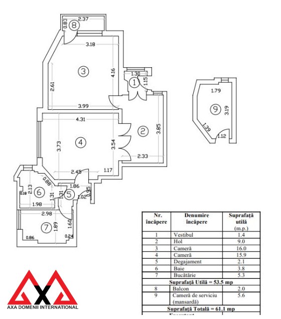 Apartamentul (cu o suprafata totala de 61,1mp) este compus din 2 camere, bucatarie, baie (cu geam), vestibul, hol si balcon, cu o suprafata de 55,5mp la care se adauga o camera de serviciu la mansarda (aflata in proprietate) cu o suprafata de 5,6mp.