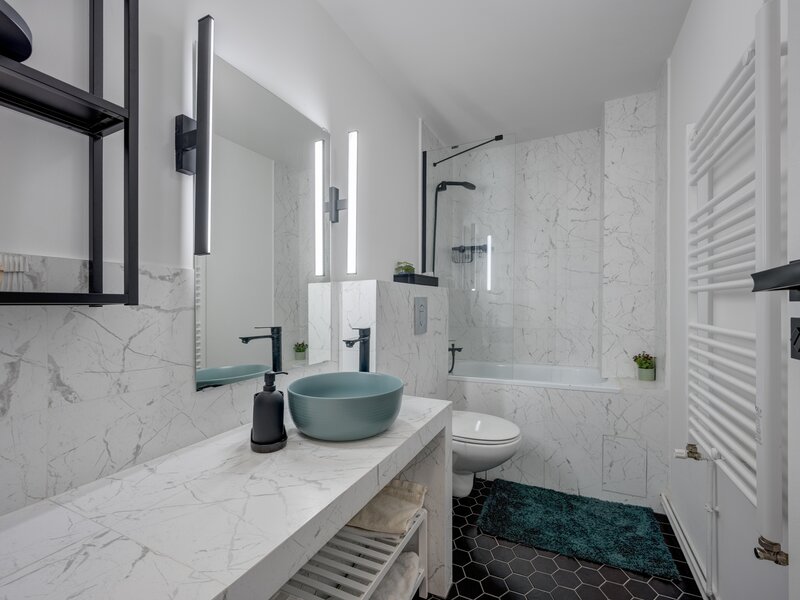 Uite cateva detalii care dau farmec aparamentului: usile albe Porta Doors, de lemn, mobilierul personalizat in cele mai mici detalii, marca LMN Design. Inclusiv masca de la centrala termica, dulapul si spatiul de depozitare de pe hol sunt facute la comanda. La toate geamurile avem tamplarie PVC – Profil REHAU Euro 70 (5 camere, LowE ).