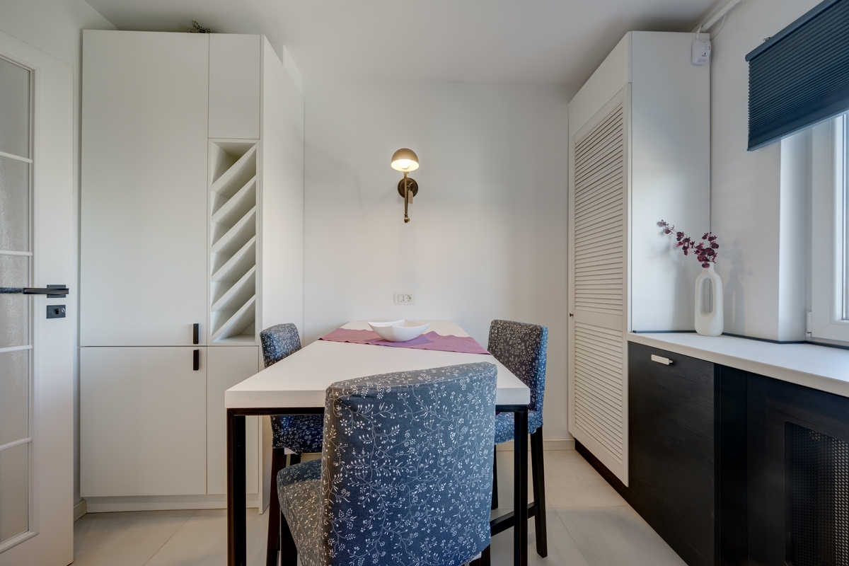Ce a insemnat renovarea? Tot, incepand de la turnat sapa, pusa izolatie, pus parchet, pana la schimbat toate instalatiile - sanitare, electrice, termice, izolat la interior peretii exteriori ai apartamentului. Pentru ca totul sa fie facut cu responsabilitate, proprietarii au apelat la o echipa integrata, de design interior si renovari profesionale.